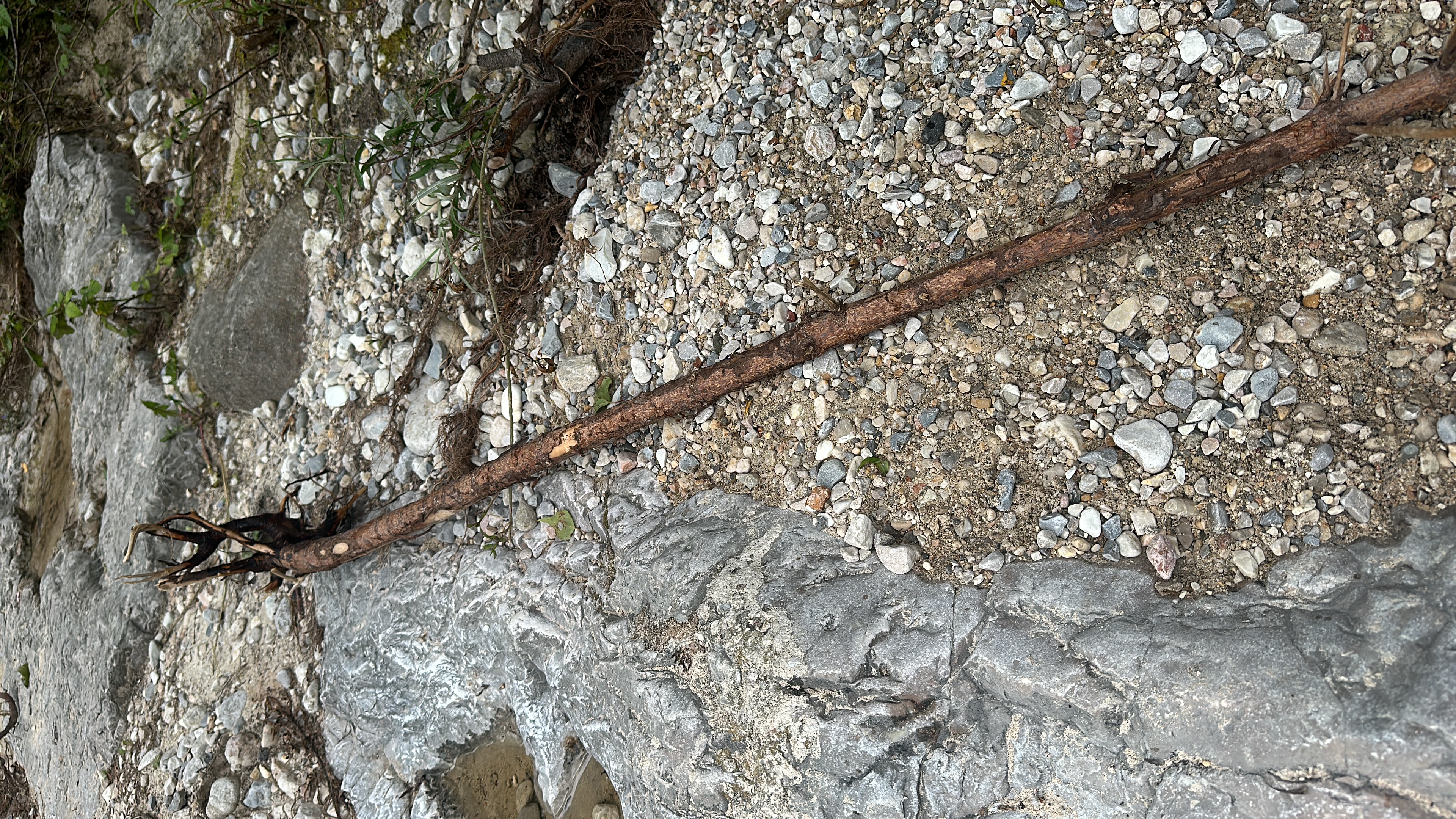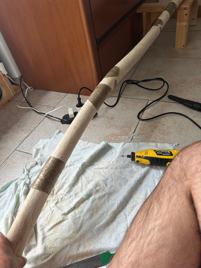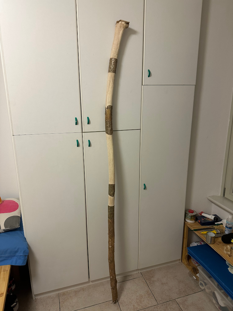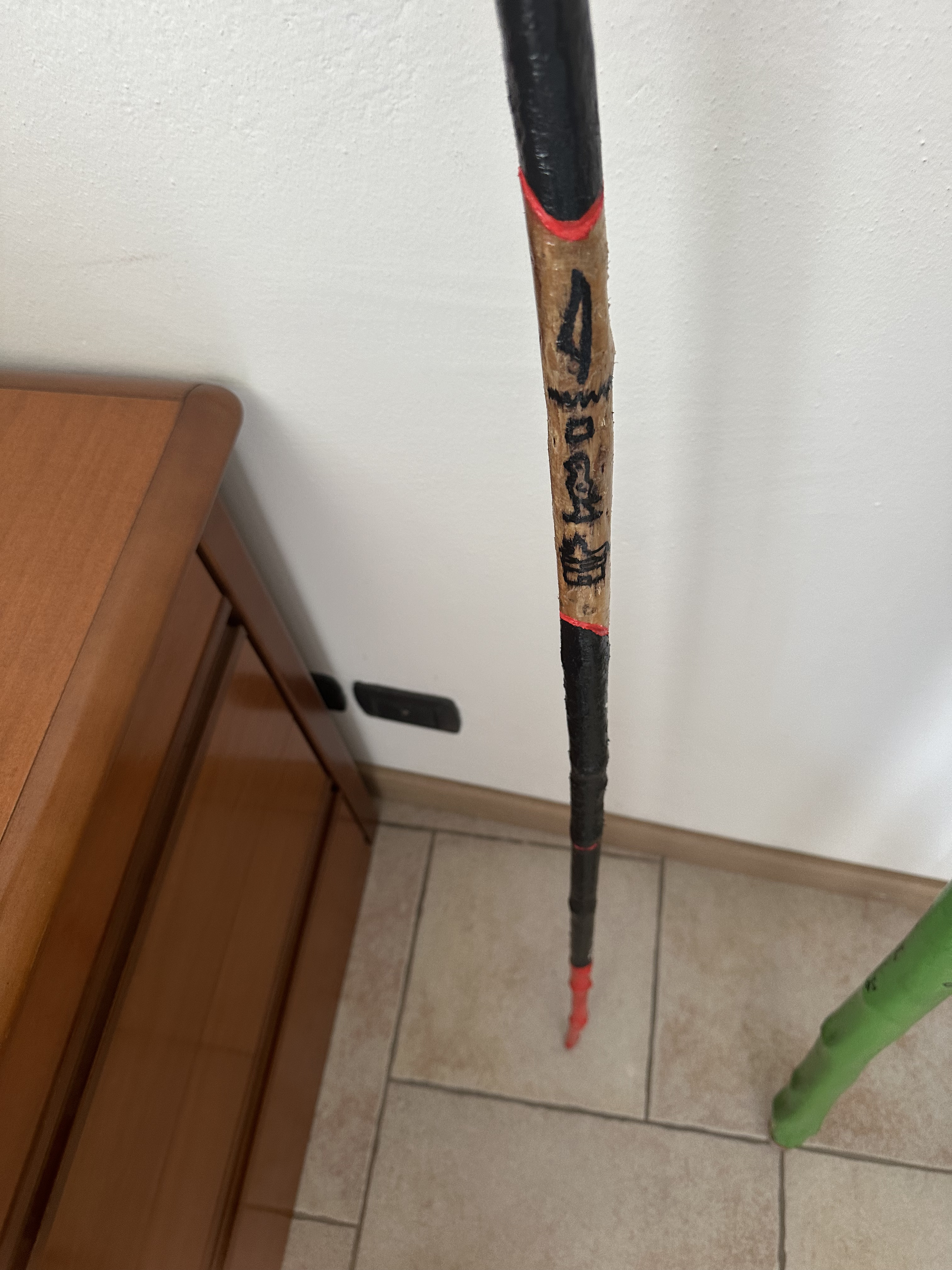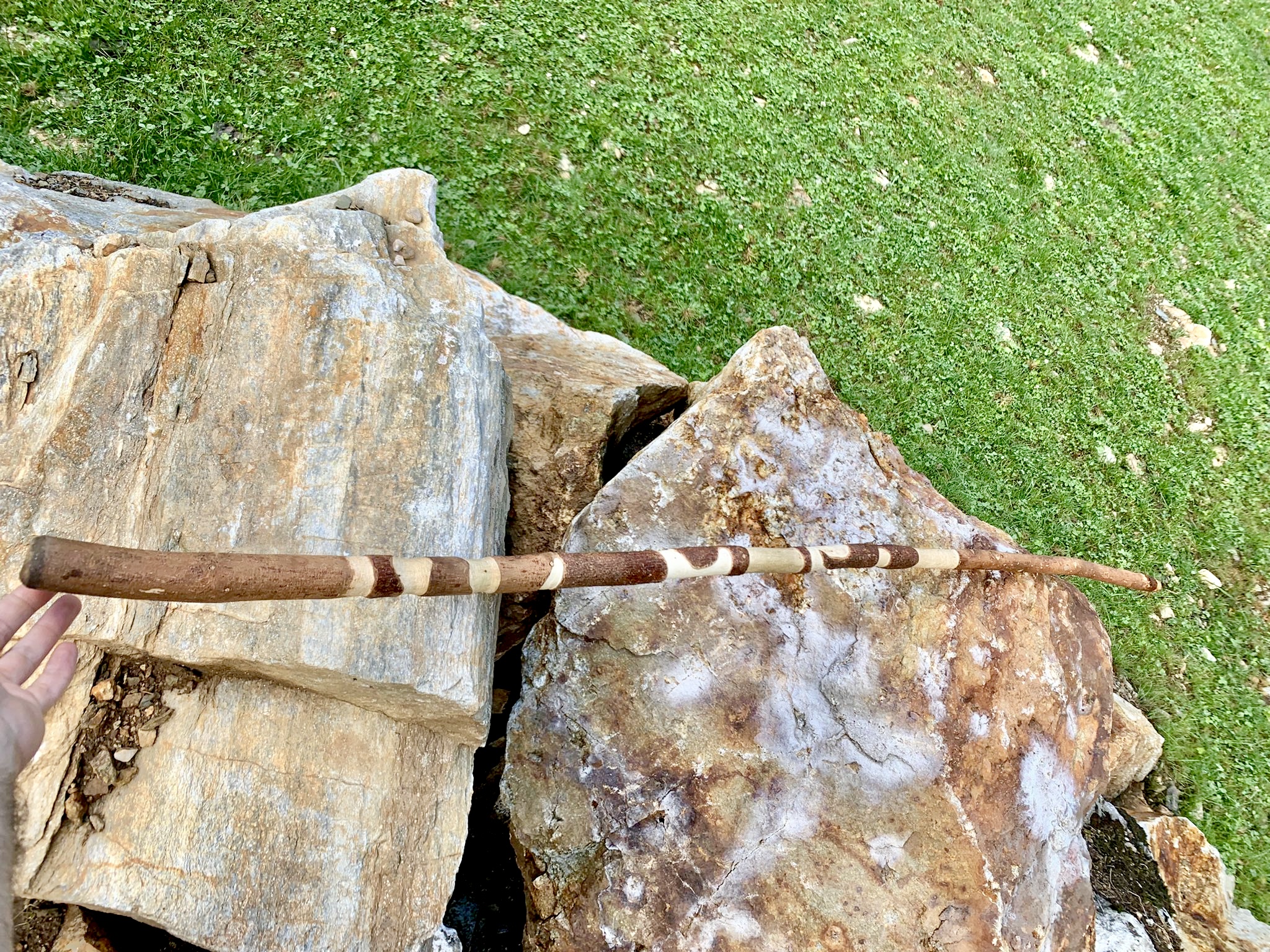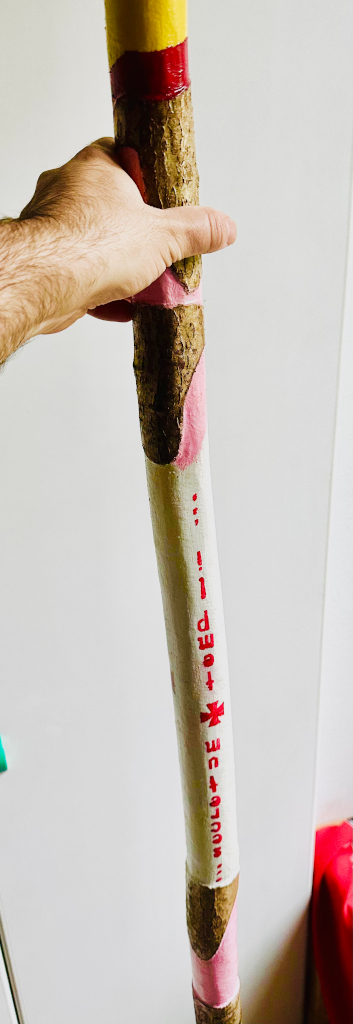 1-2. Primi intagli delle diverse tipologie di impugnatura a seconda degli usi rituali. Possibilità di diverse prese mantenendo il bastone orizzontale. Bastone in legno di Abete Rosso (Val di Rabbi -TN-). In un primo momento il suo nome era “Nija Itazipa” che in lingua indiano Lakota, significa "Arco degli Spiriti"; infatti se esso è per diverso tempo lasciato alla luce del sole, di notte si illumina, poiché è stato rivestito di colori fluorescenti del medesimo gradiente di quelli acrilici di base.
