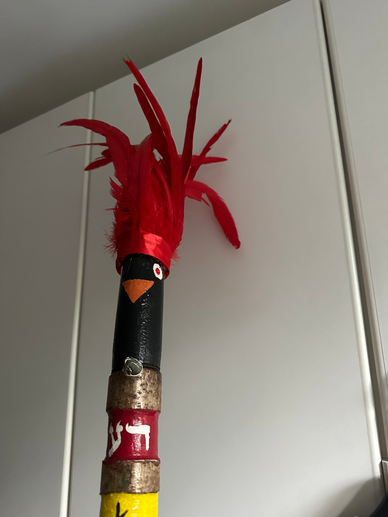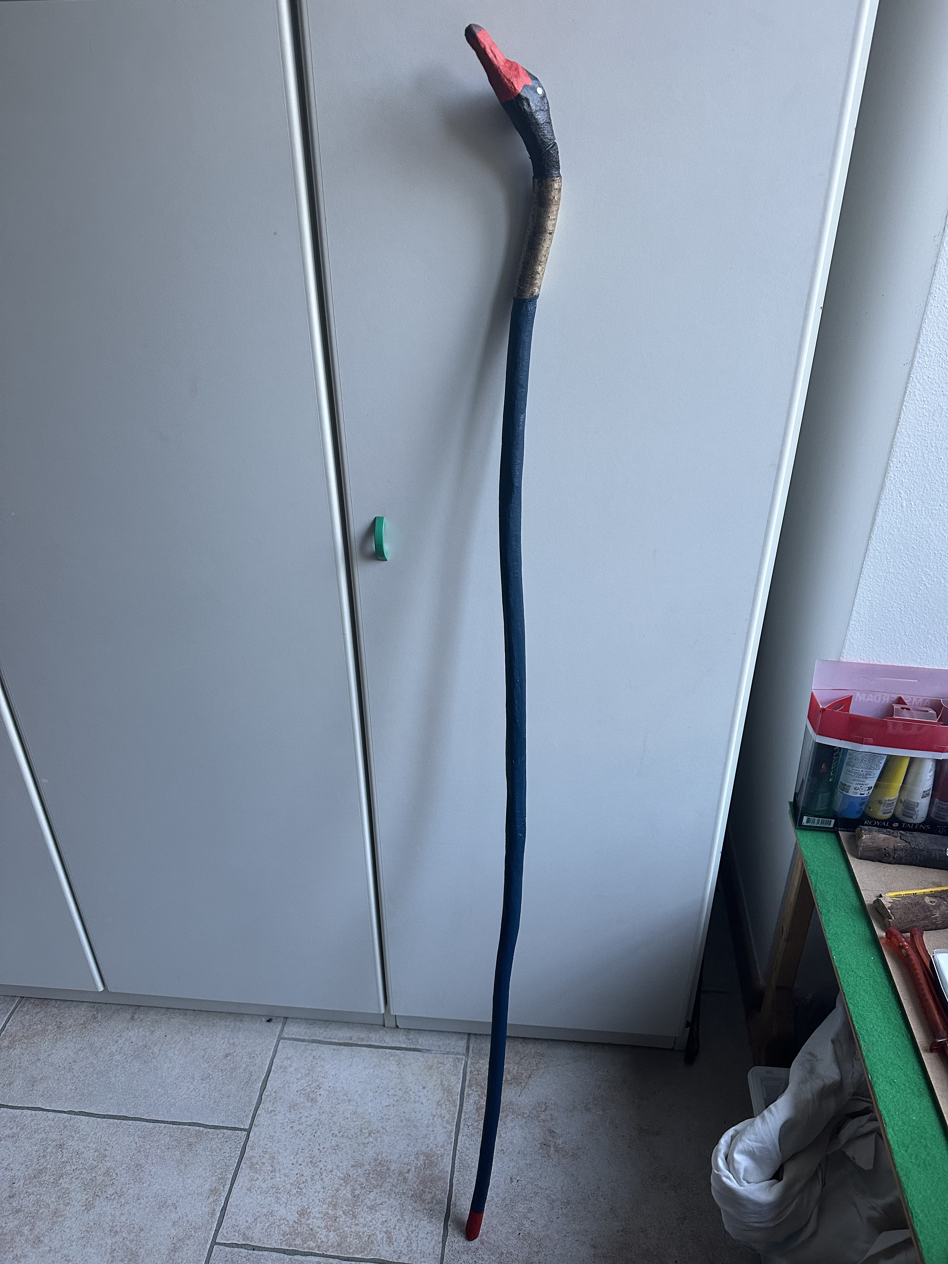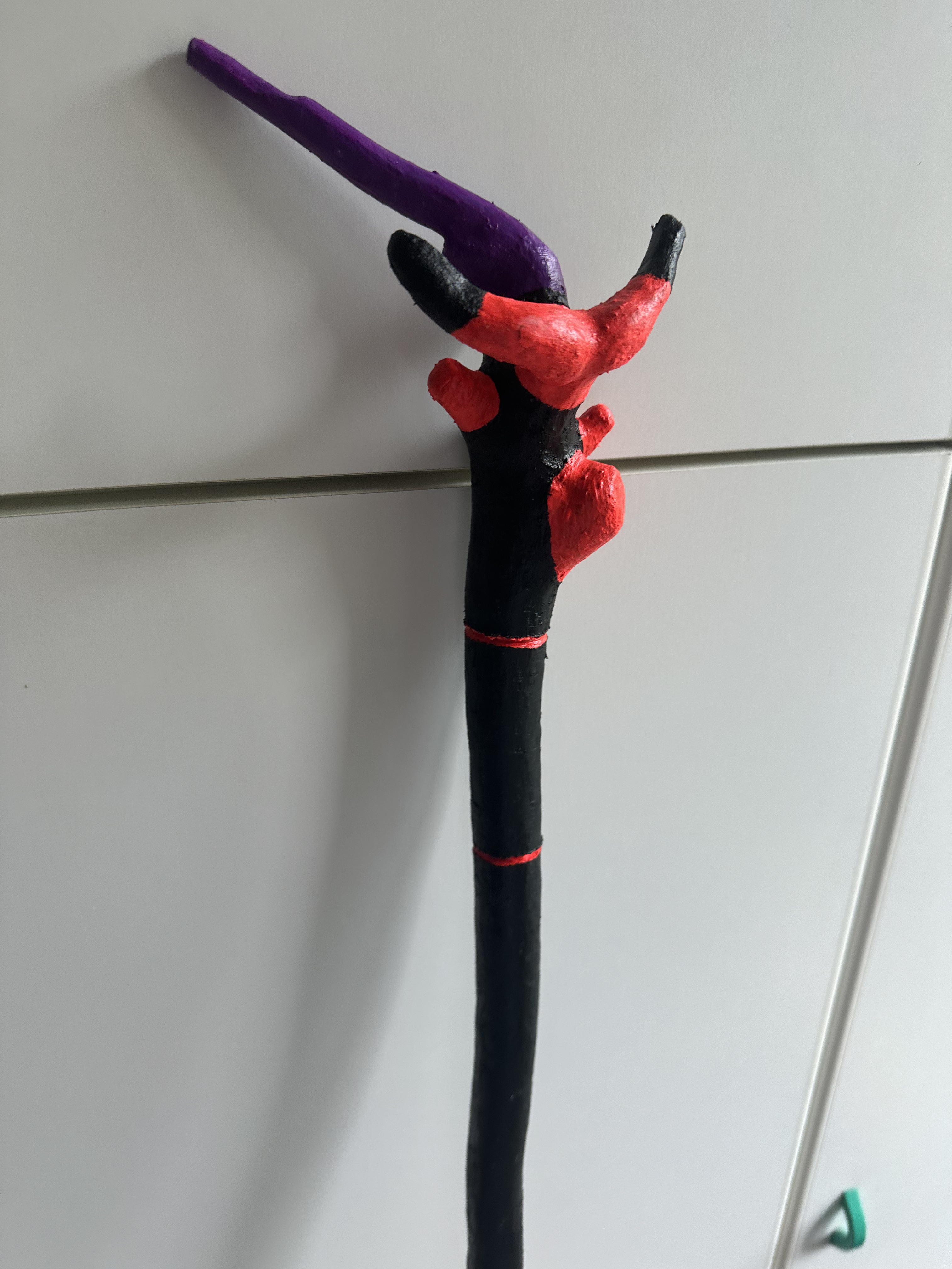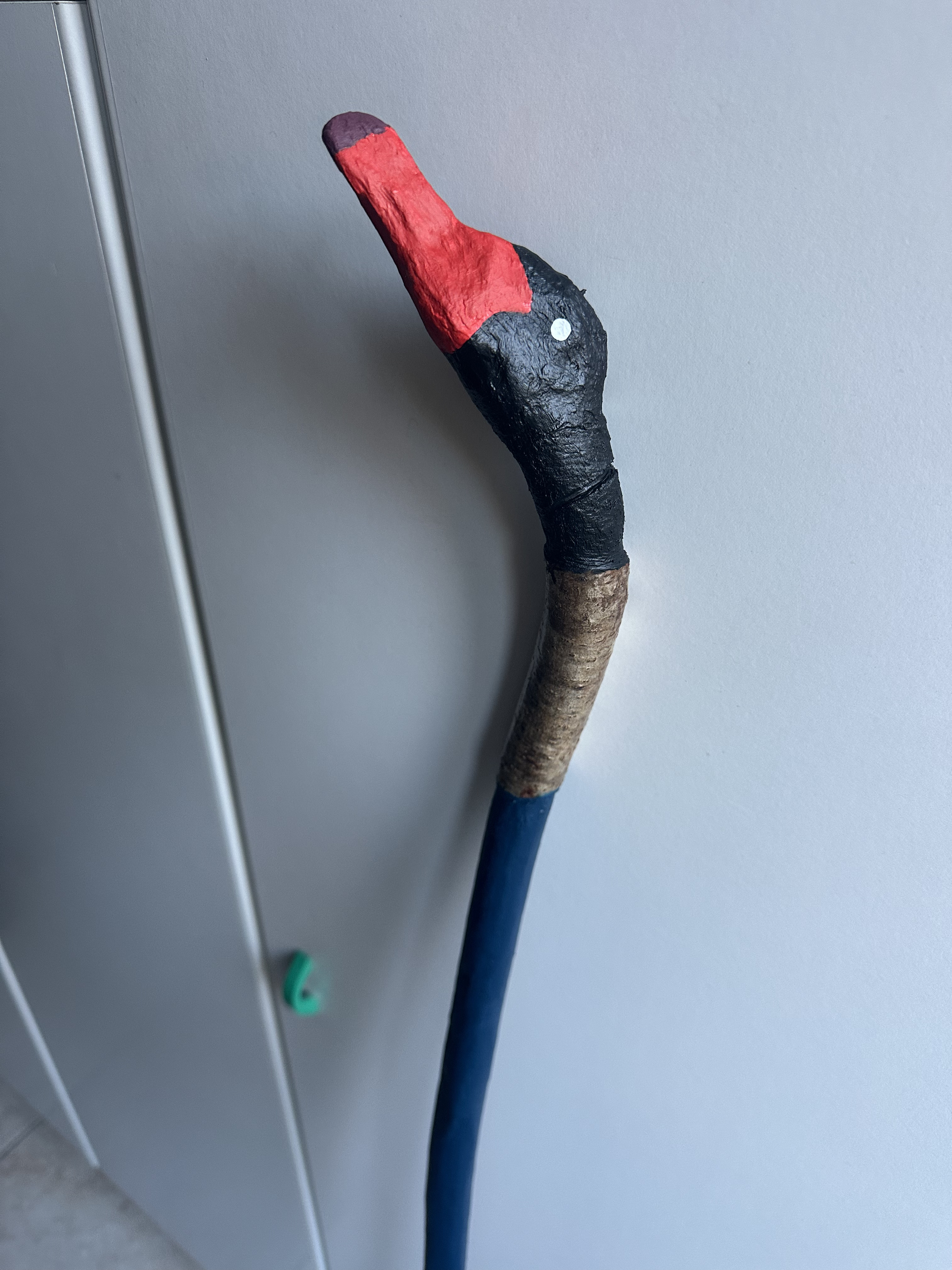 6. La testa del cigno nero è un simbolo di soglia e trasformazione profonda. Il cigno nero incarna l’ignoto che irrompe, l’evento iniziatico che spezza le certezze e costringe a una nuova visione: non distrugge, rivela. Il becco rosso richiama il 1° chakra, la forza vitale, l’istinto incarnato, il radicamento nella materia e nel sangue della vita; è l’energia che permette di stare nel mondo senza fuggire. La punta viola richiama il 7° chakra, la trascendenza, la coscienza superiore, l’apertura al divino. Tra rosso e viola il cigno fa da ponte: trasforma l’istinto in visione, la materia in consapevolezza. Il bastone diventa asse iniziatico: dalla terra al cielo, passando per l’ombra accettata.