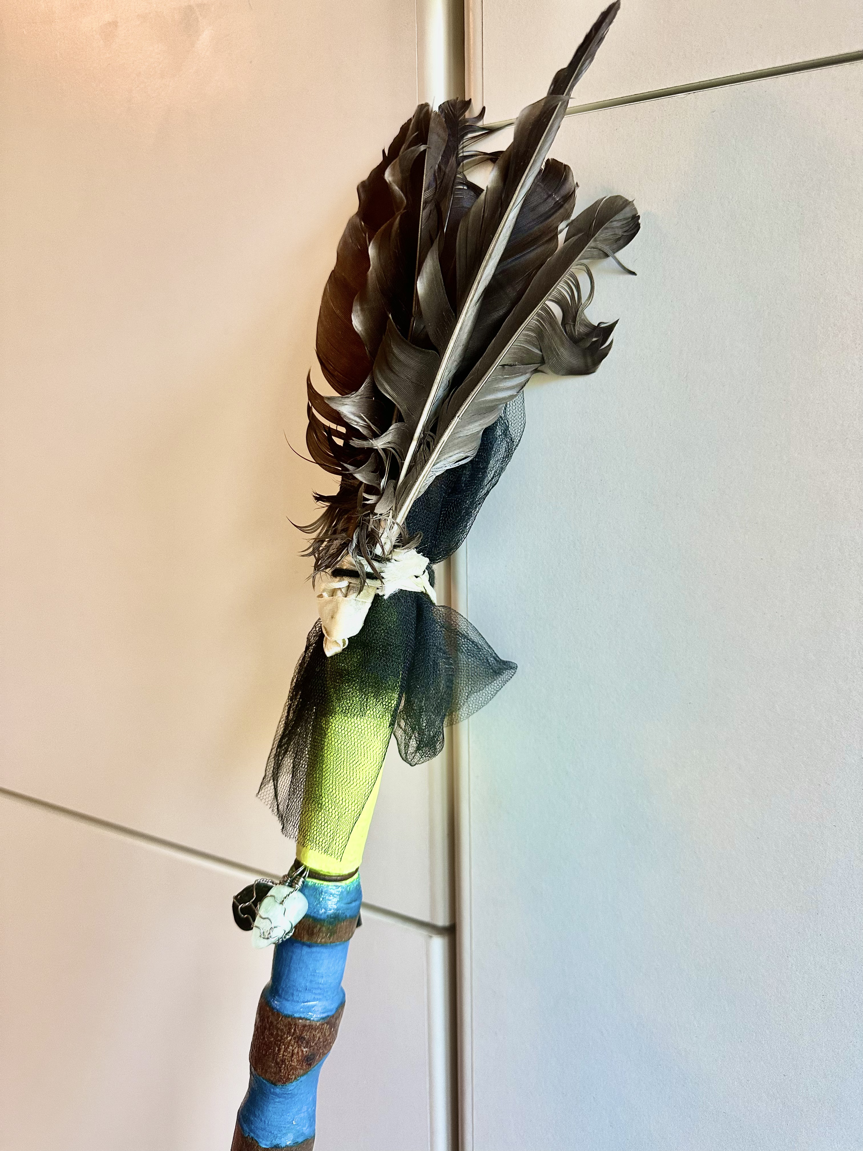 4. Si notano le piume di corvo (Aria) che rappresentano il mio spirito guida/animale Totem, un velo nero sulla "faccia" del bastone che simboleggia lo spirito di Sara La Kali, la "Madonna Nera" (Acqua). Poi ci sono due pietre; quella verde scuro è una Blood Stone sacra a Morrigan, mentre l'altra, Fluorite, legata al mondo degli spiriti.