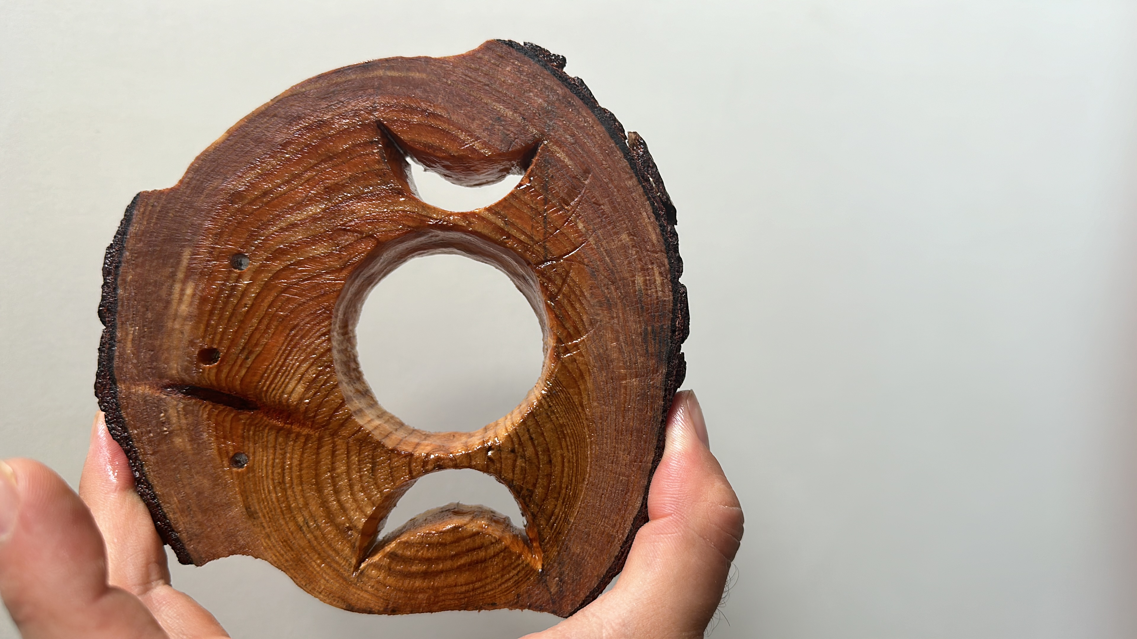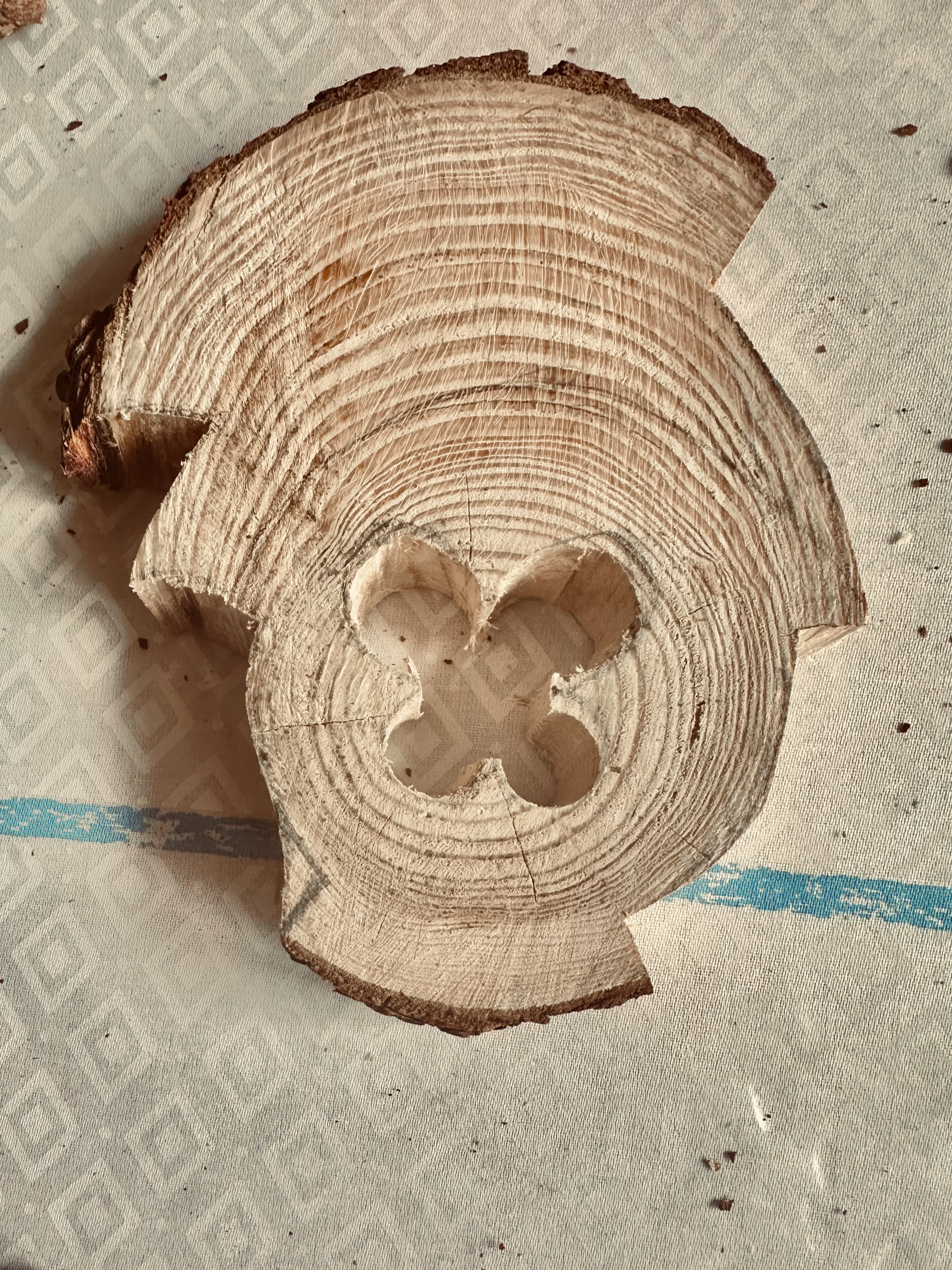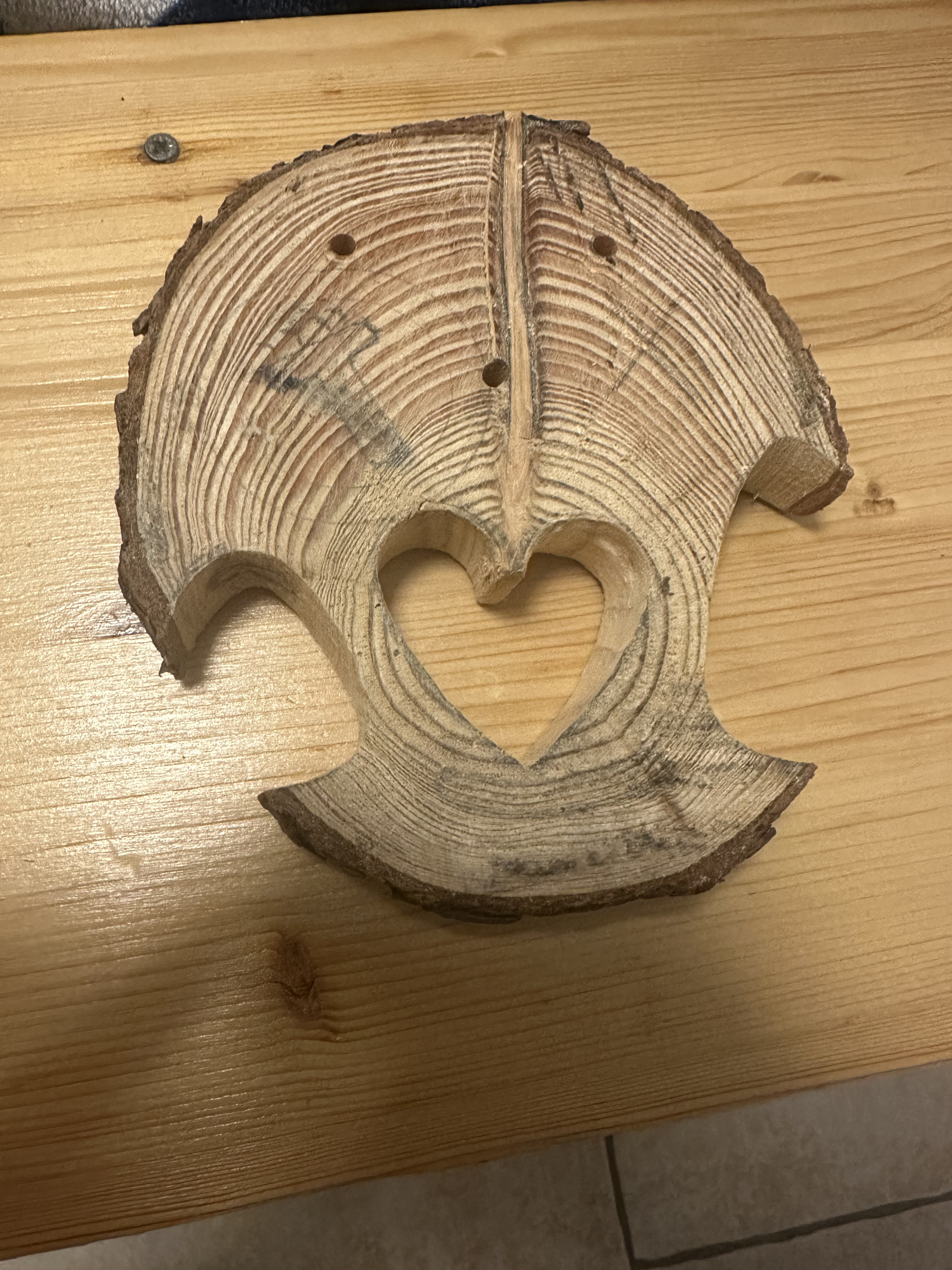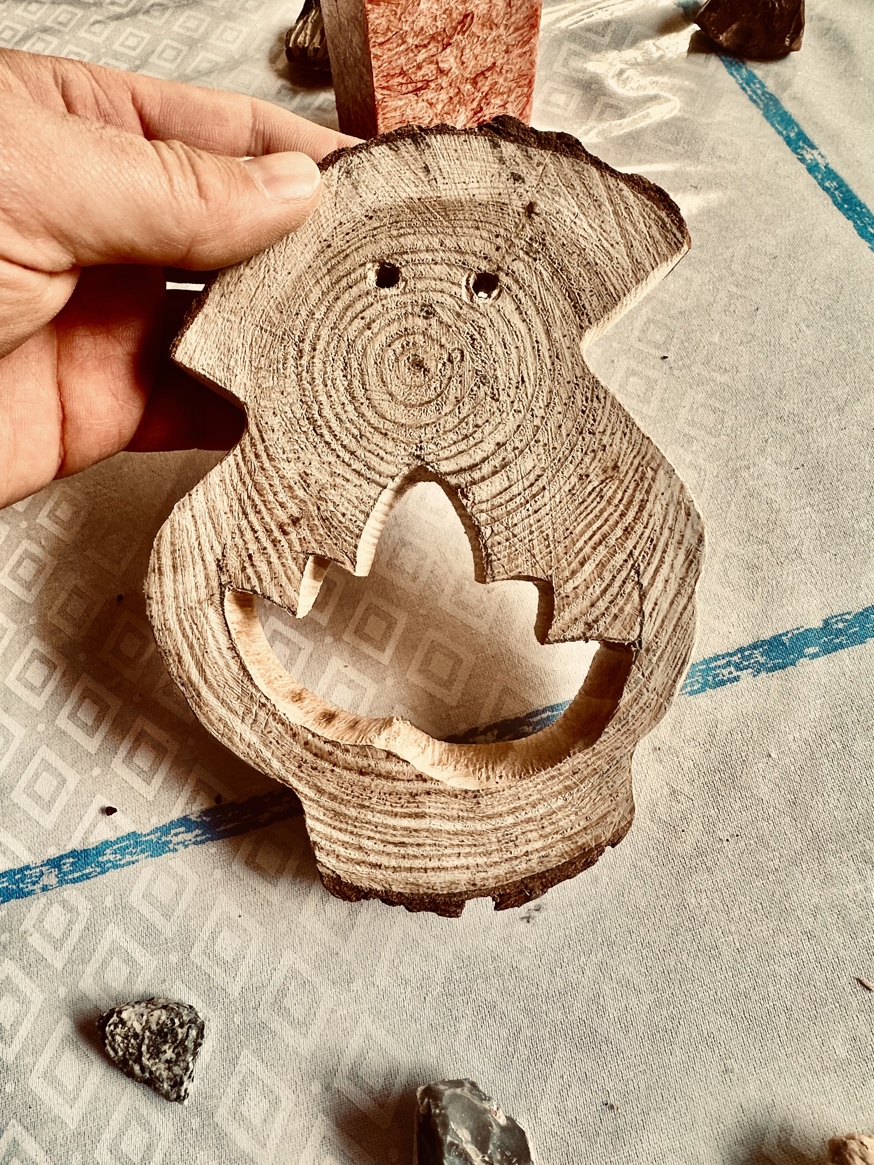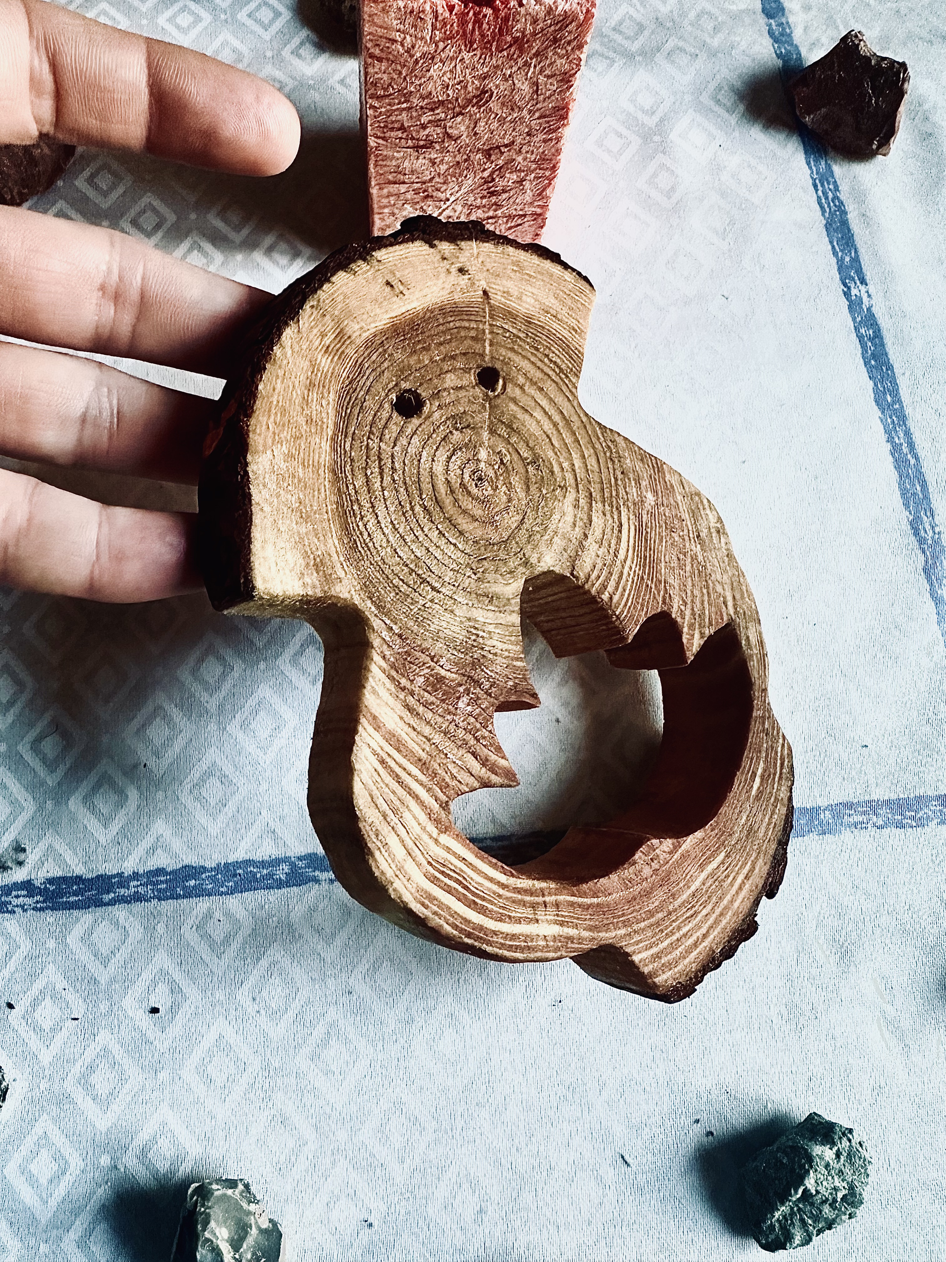 Questo pendaglio rituale è il secondo della serie "chakra" proveniente dallo stesso ciocco di legno e quindi di pino della Valle di Gresta (TN).