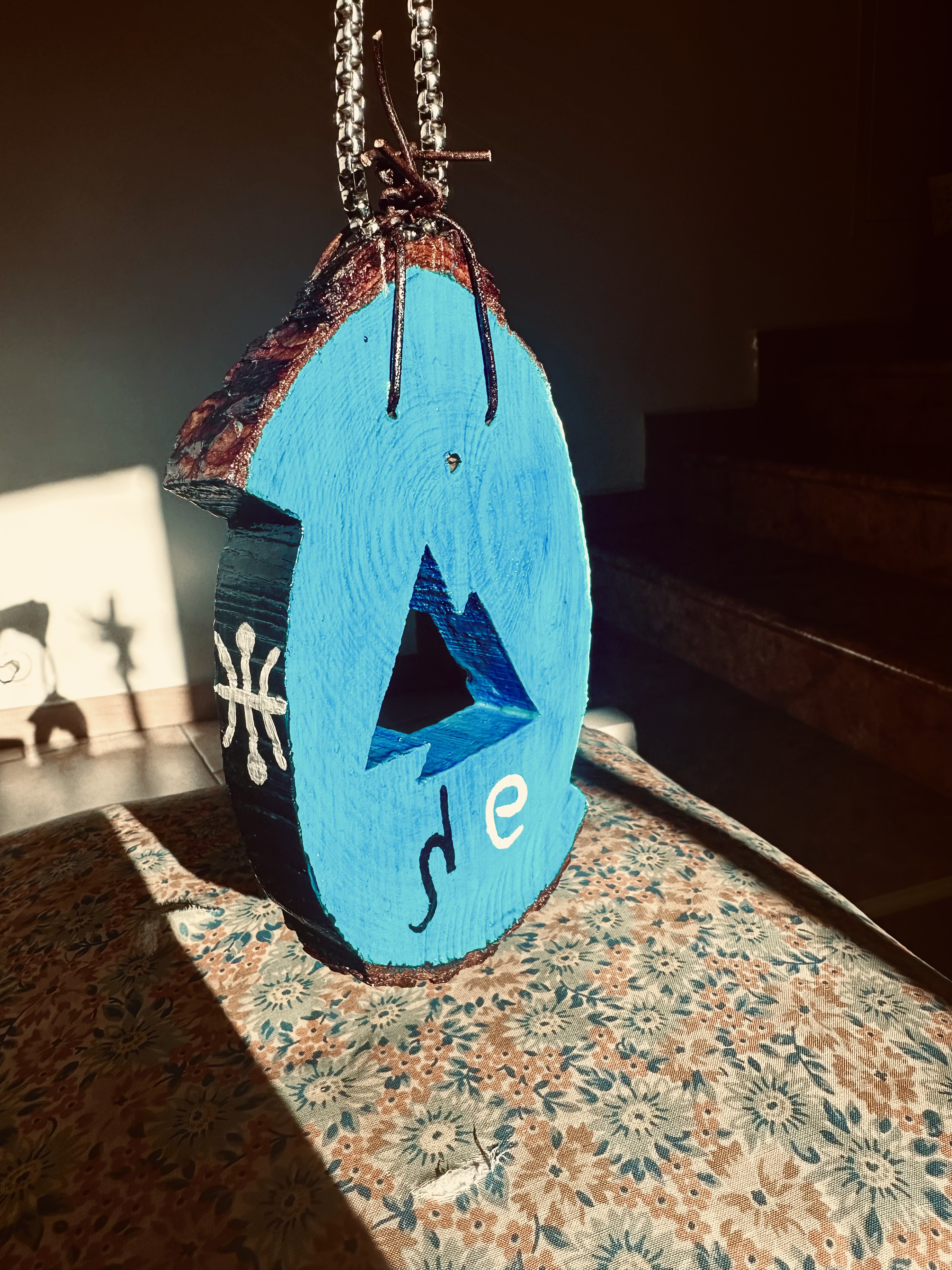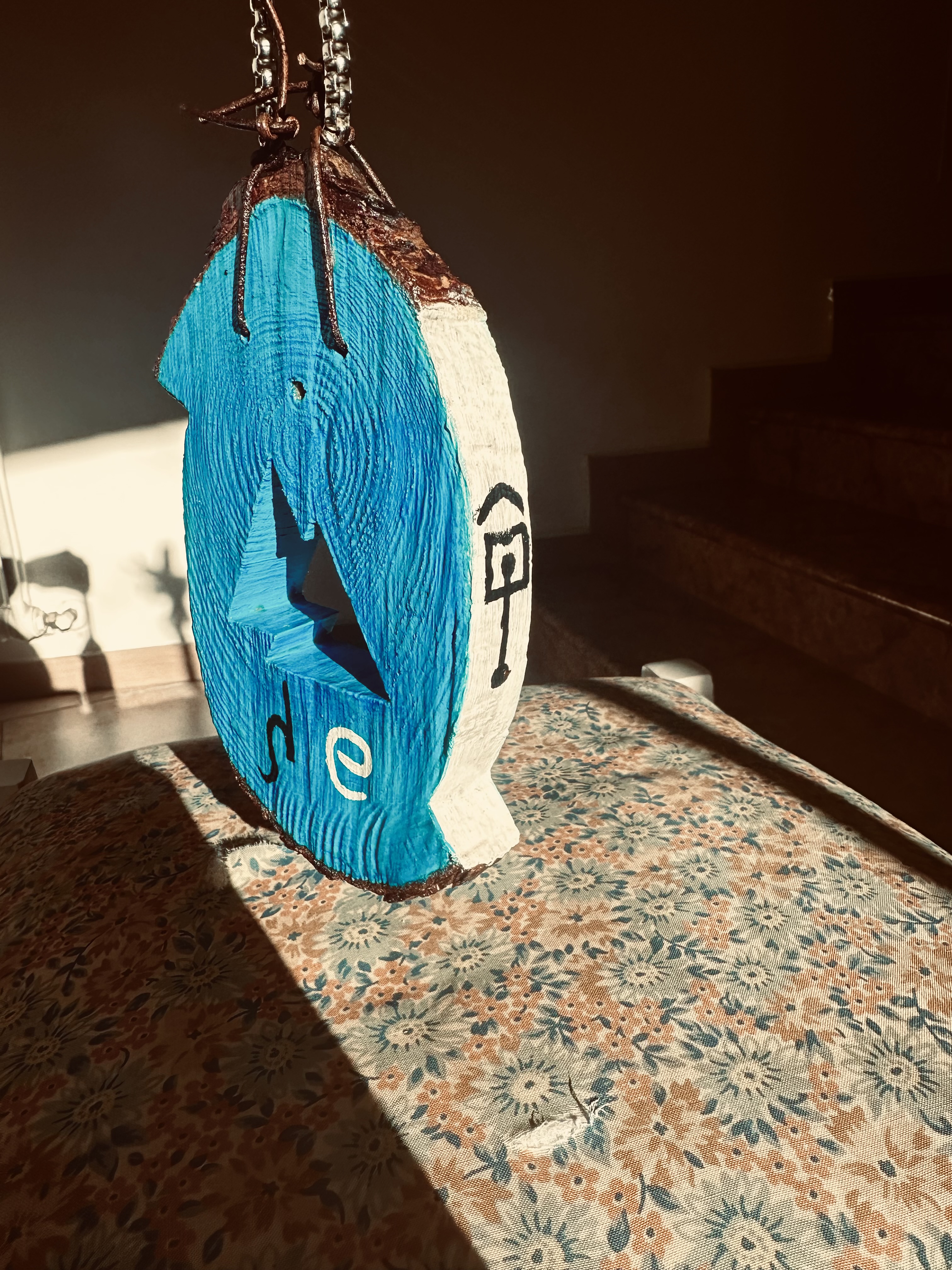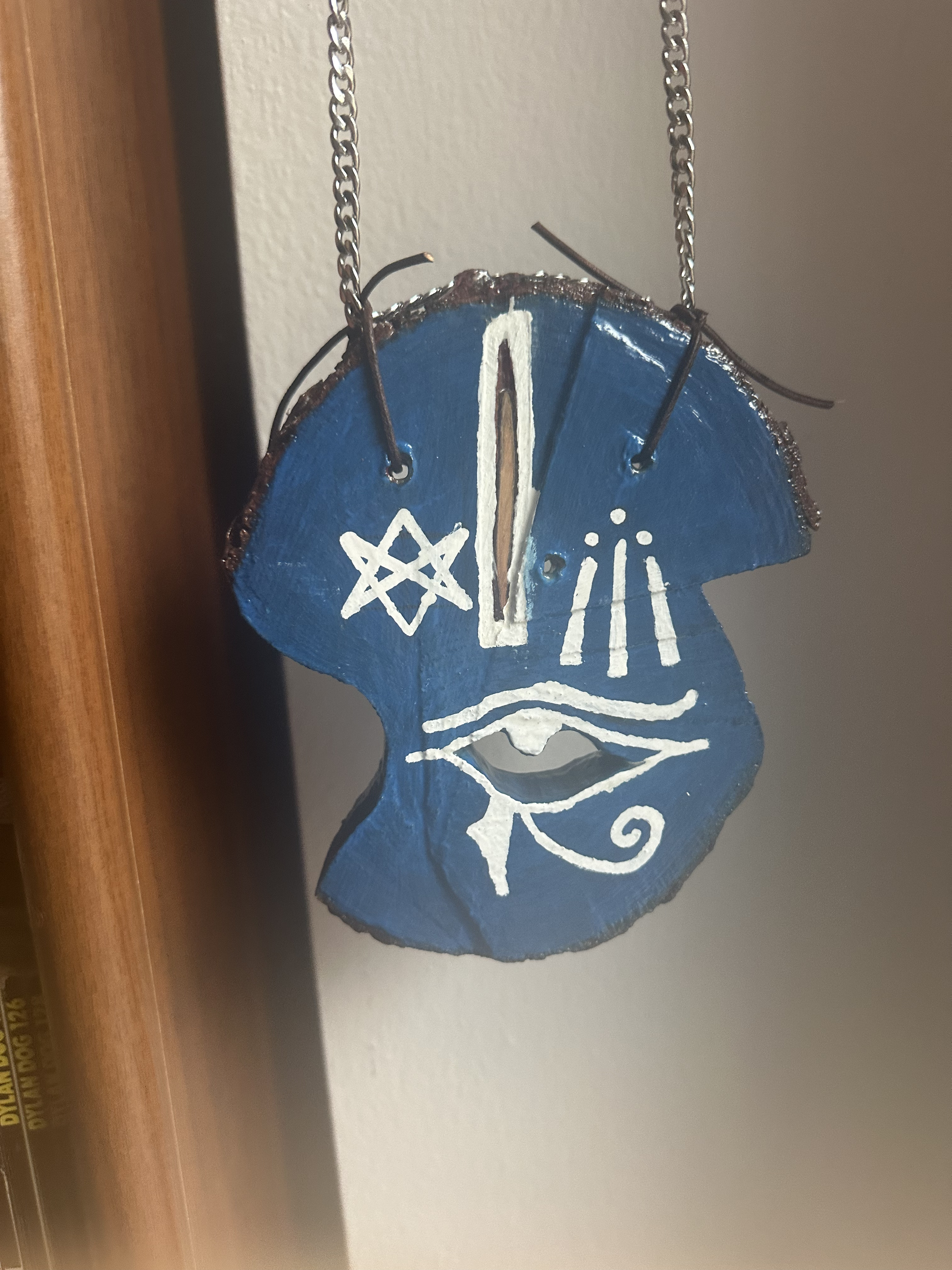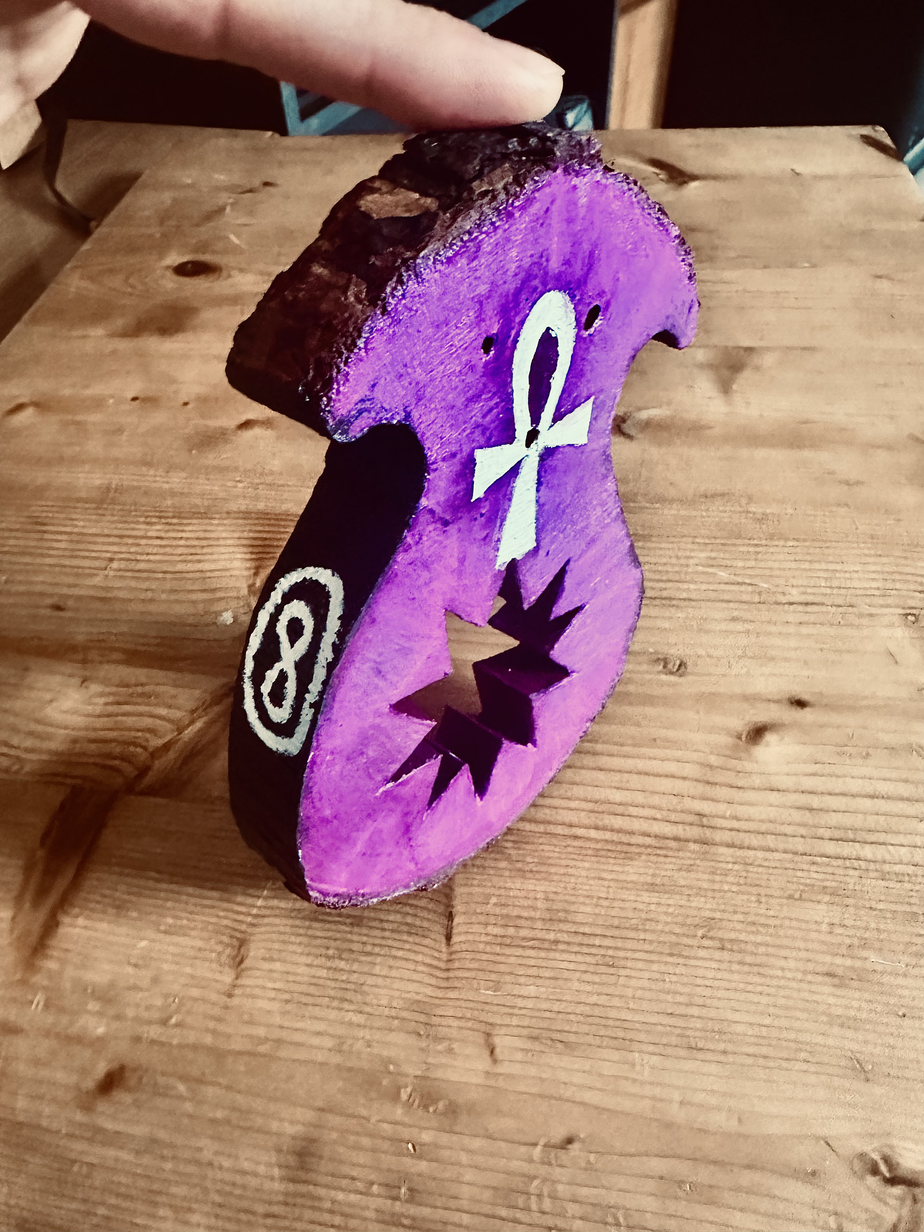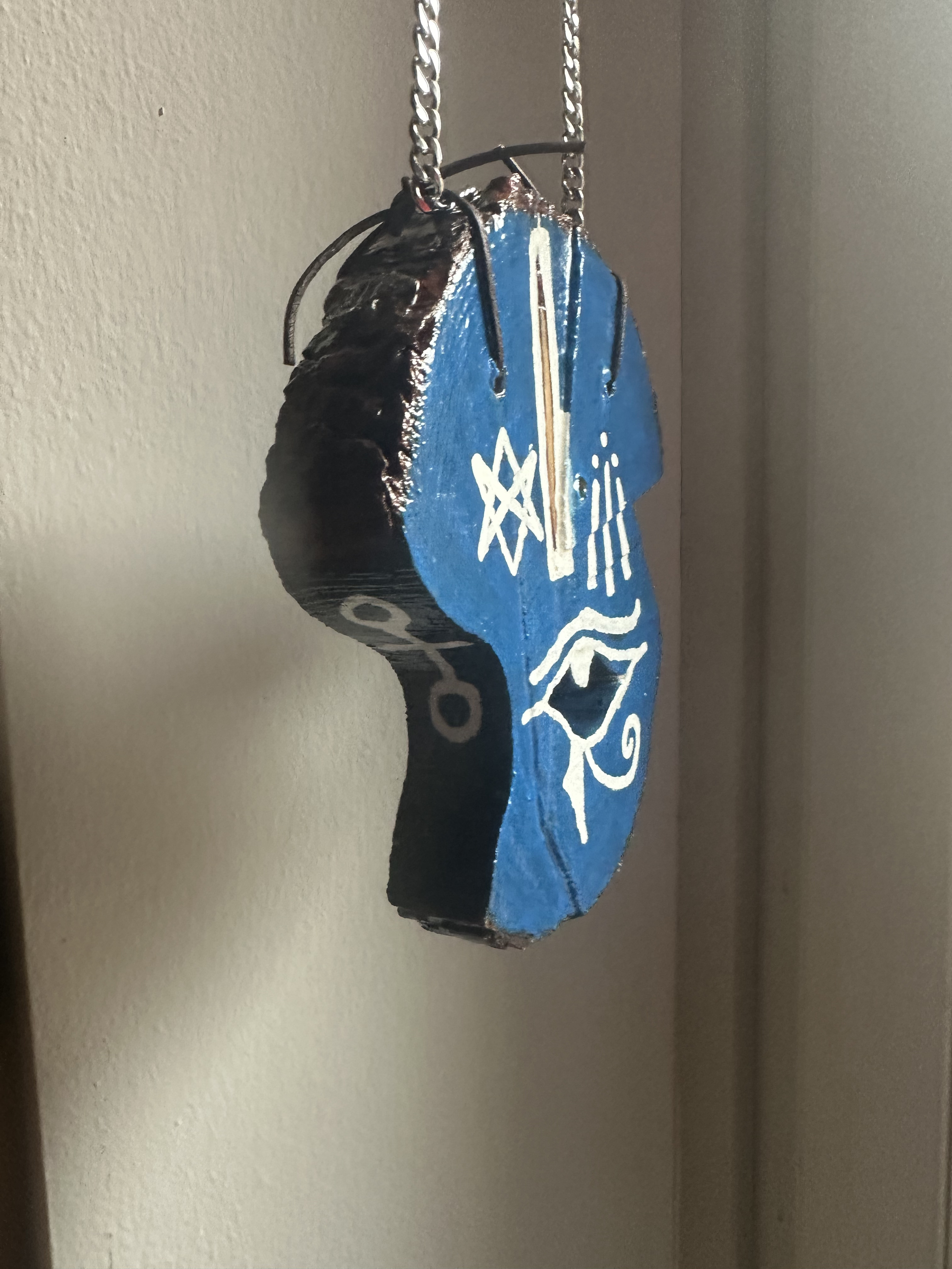 Questo pendaglio rituale è stato completamente creato in diverse canalizzazioni senza una vera intenzione precisa; forme e simboli sono usciti da essa senza una premeditazione. Il legno utilizzato è un pino della Val Di Gresta (TN).