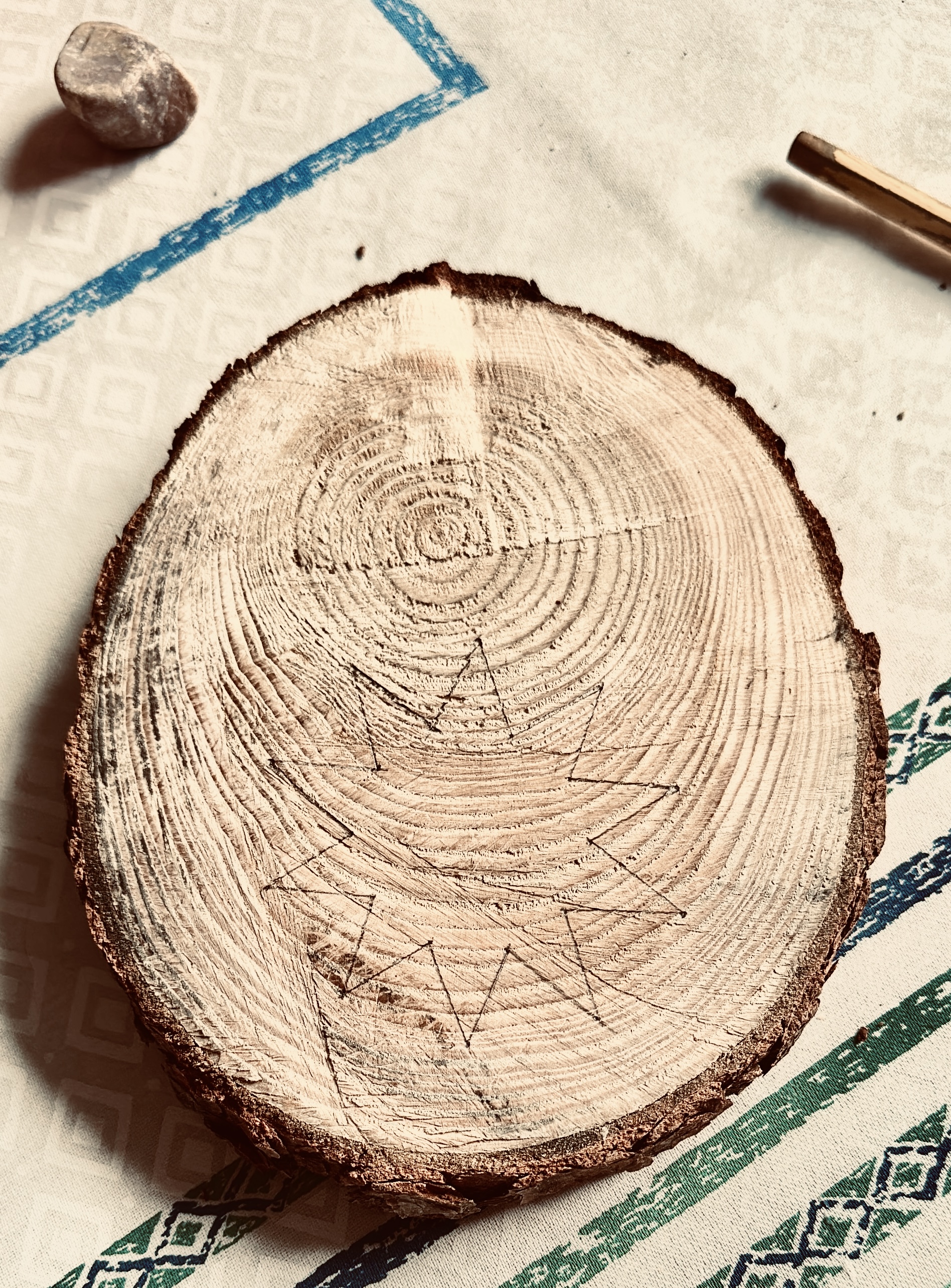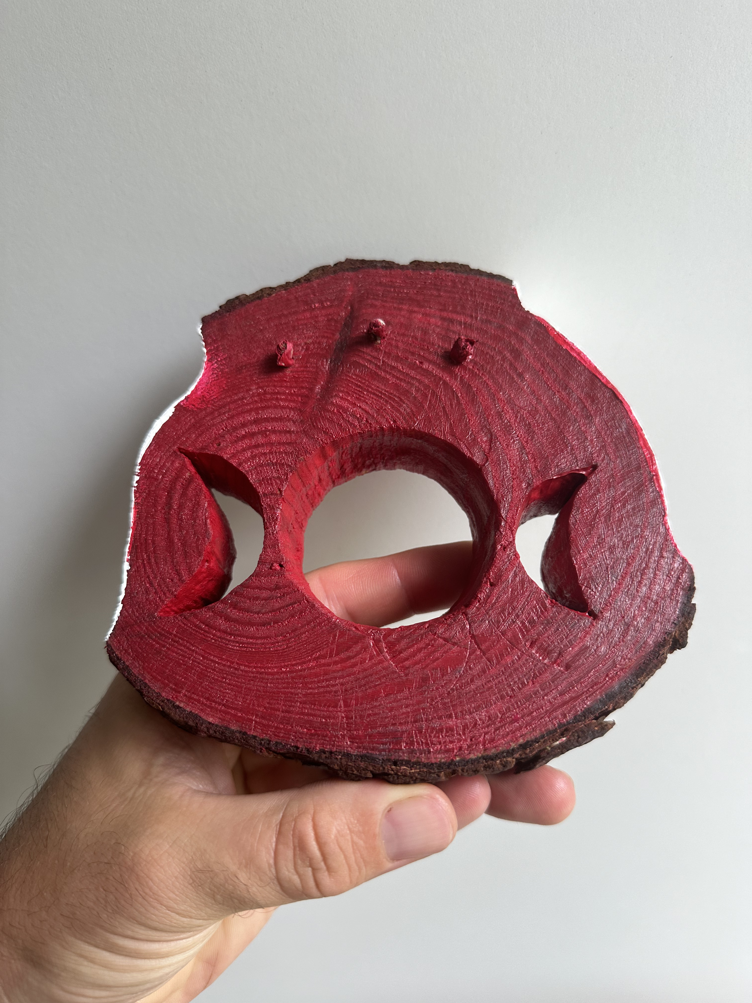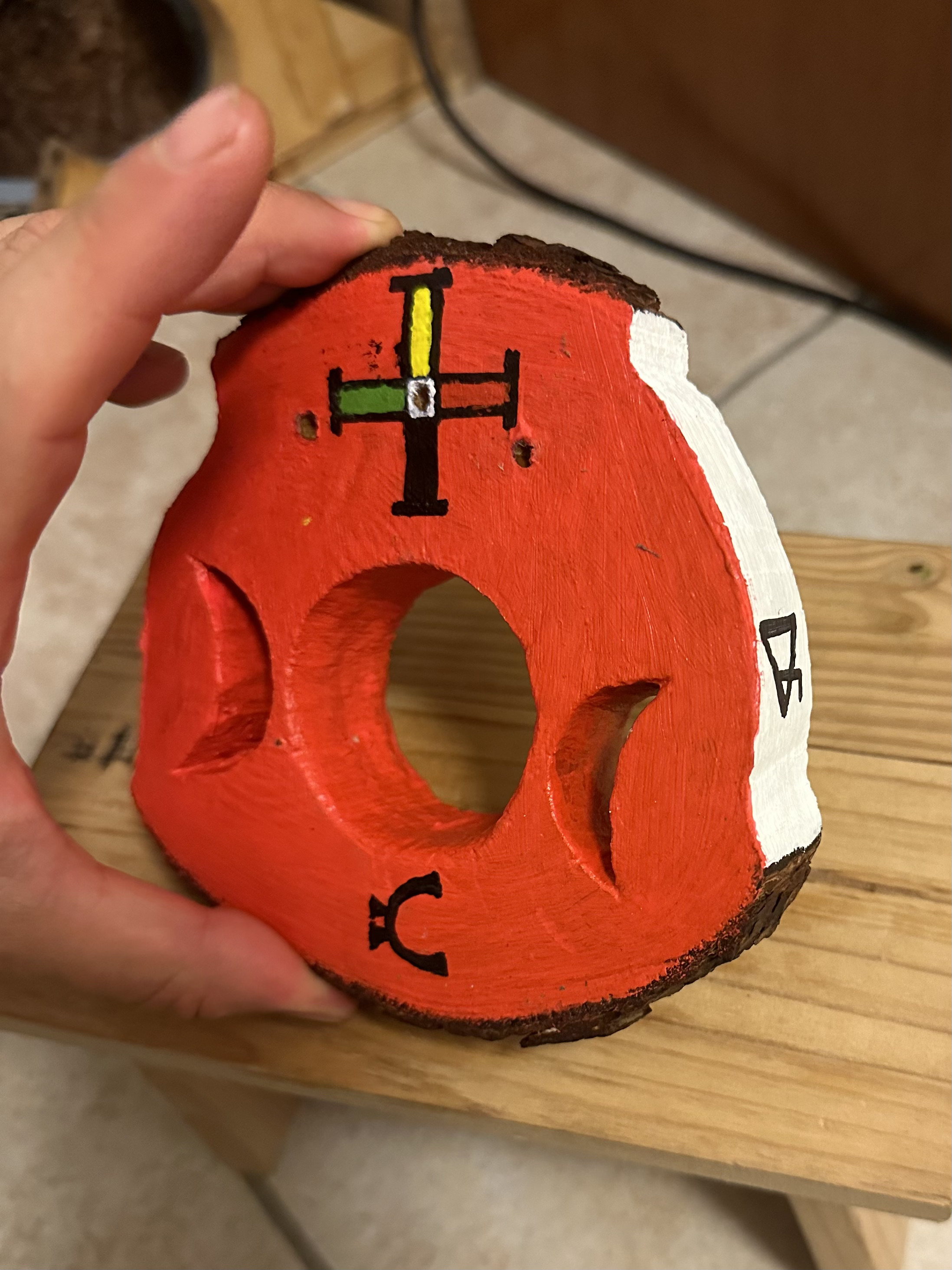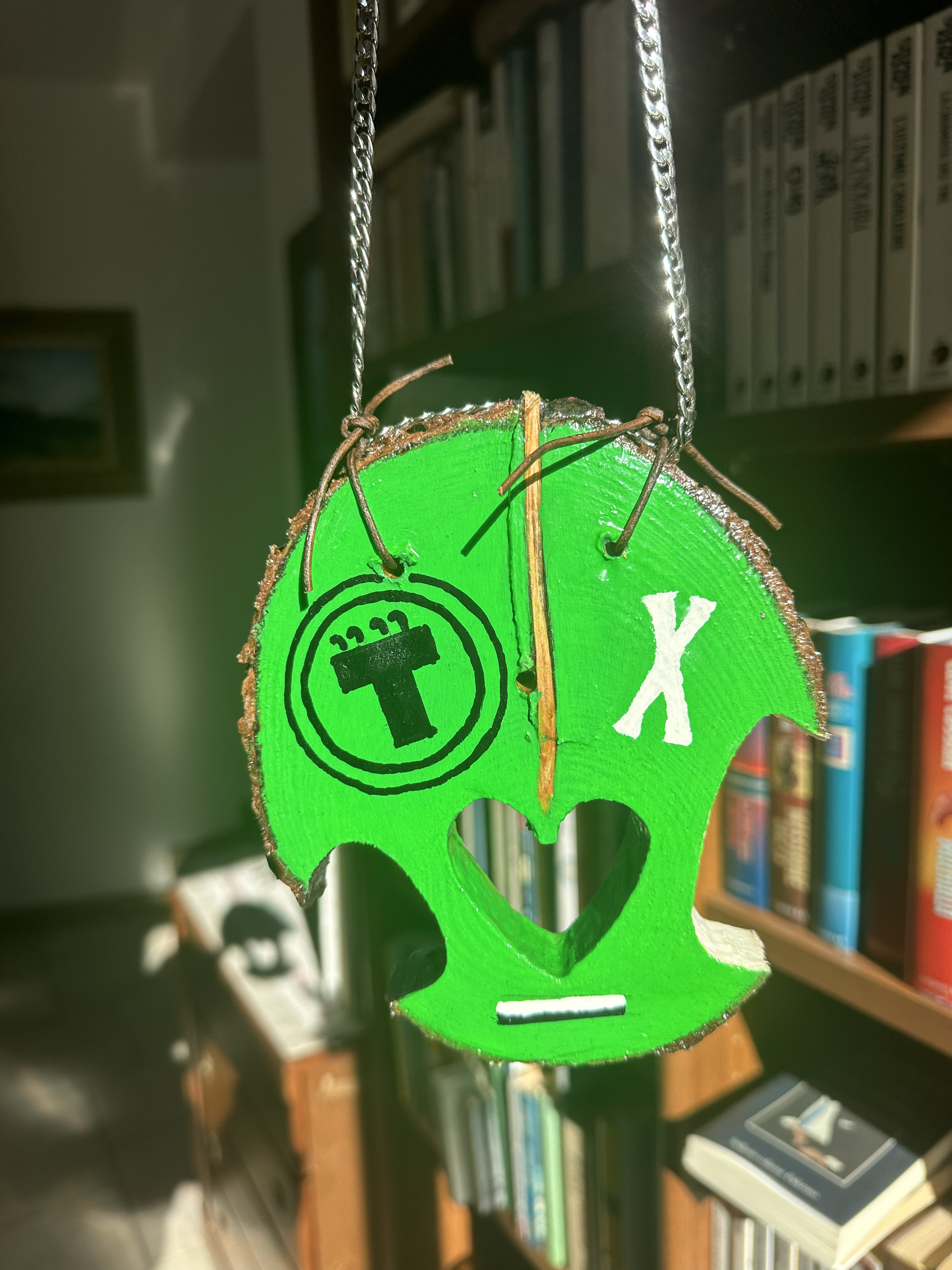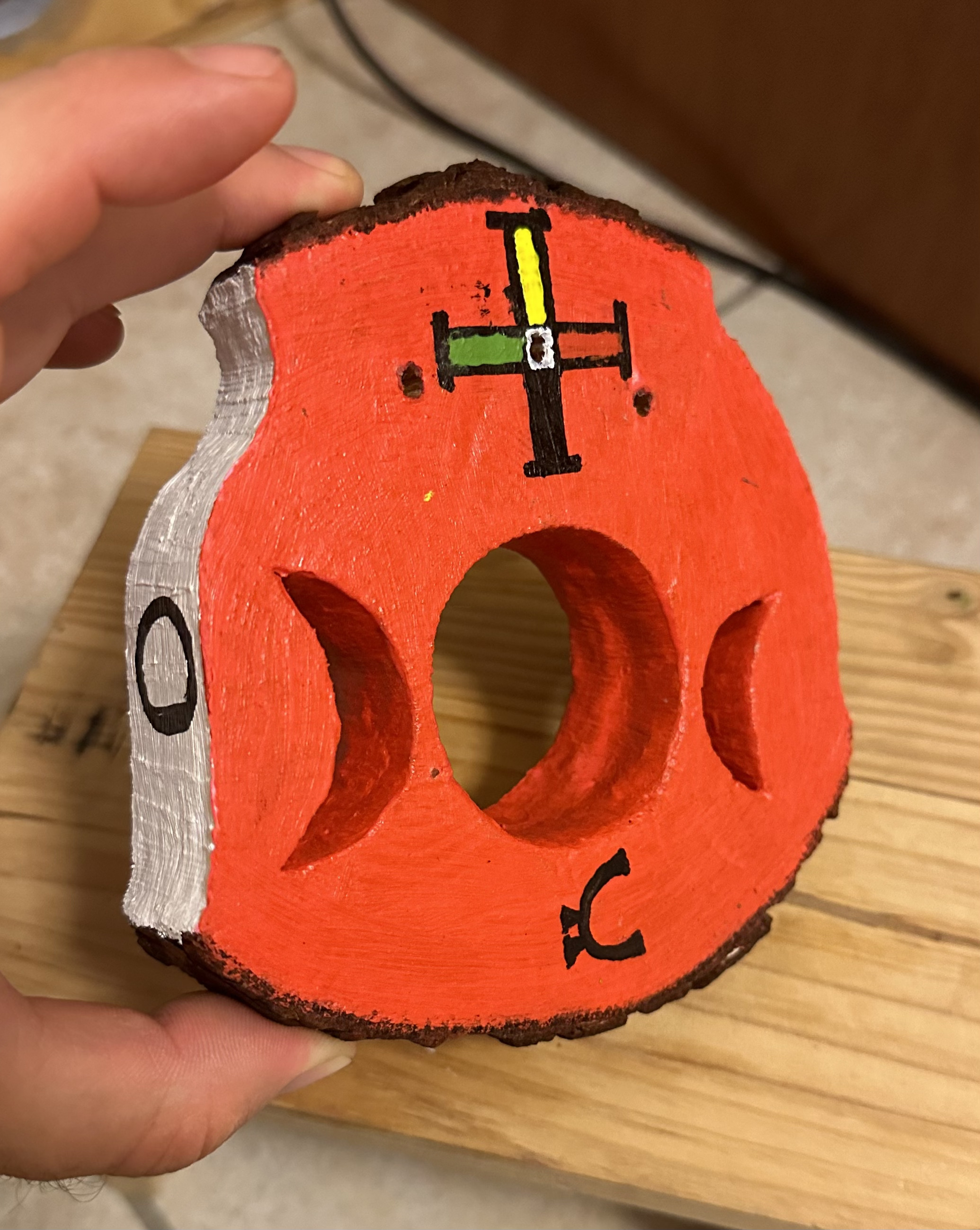 Questo pendaglio rituale è stato completamente creato in diverse canalizzazioni senza una vera intenzione precisa; forme e simboli sono usciti da essa senza una premeditazione. Il legno utilizzato è un pino della Val Di Gresta (TN).