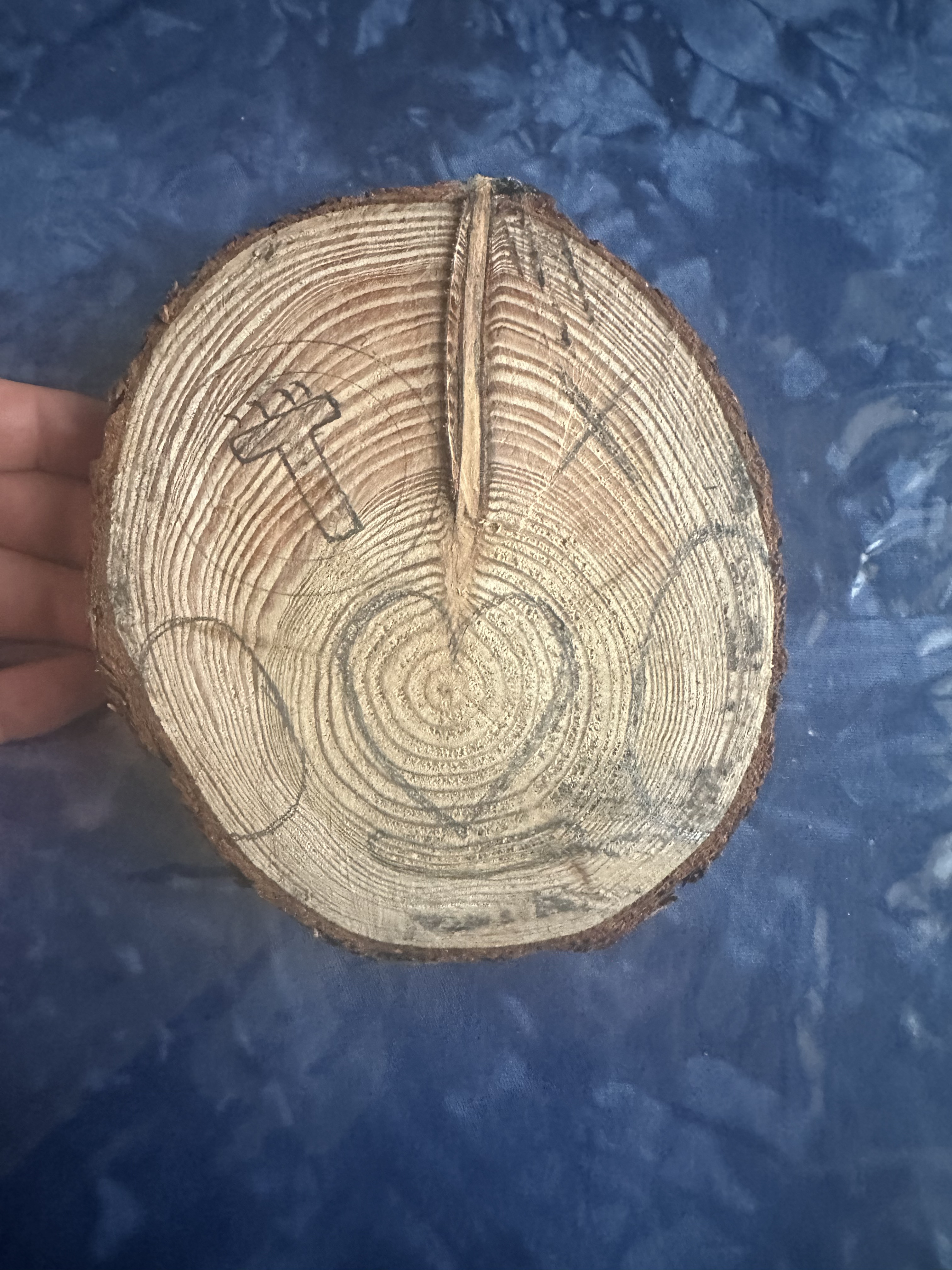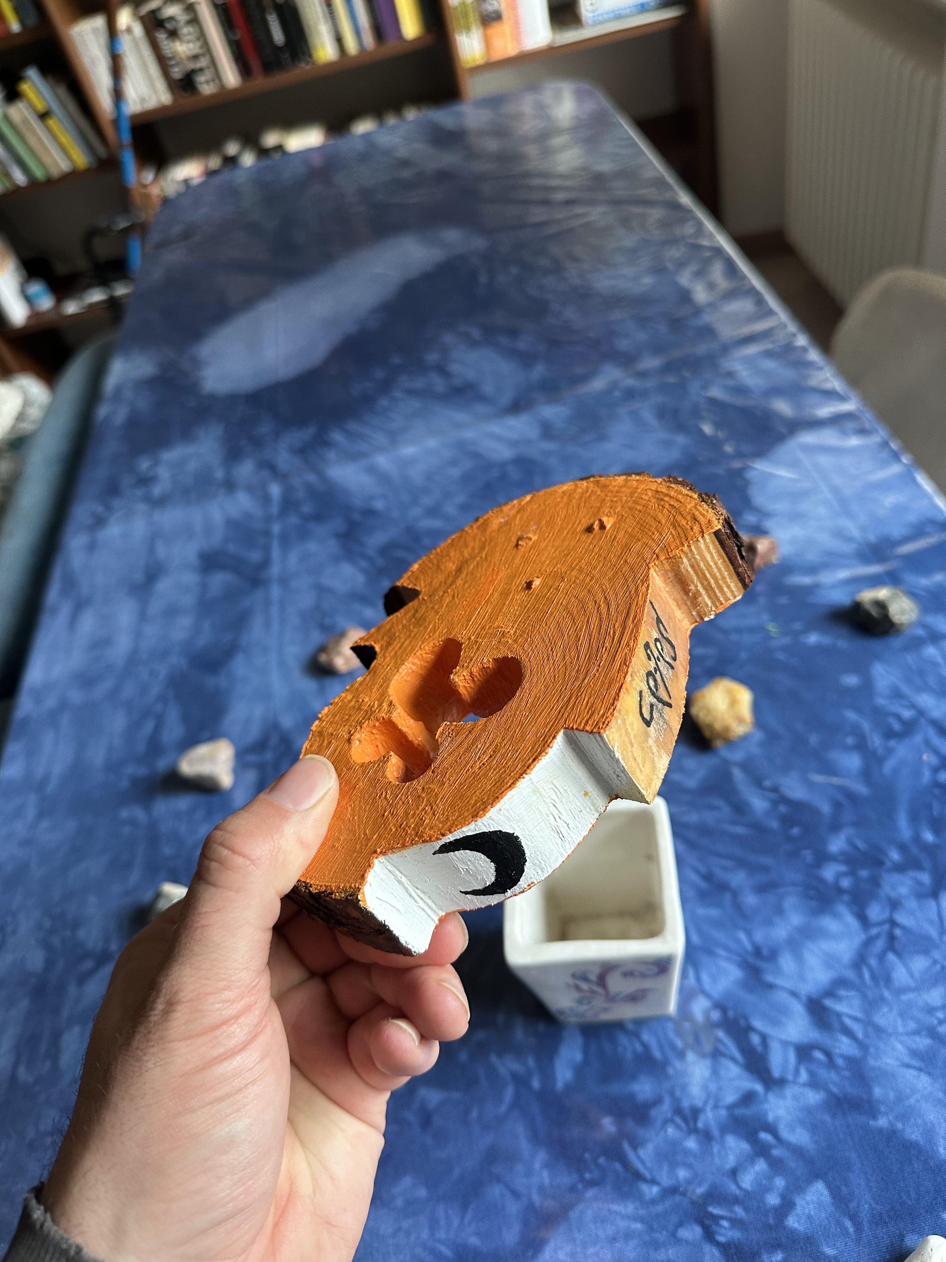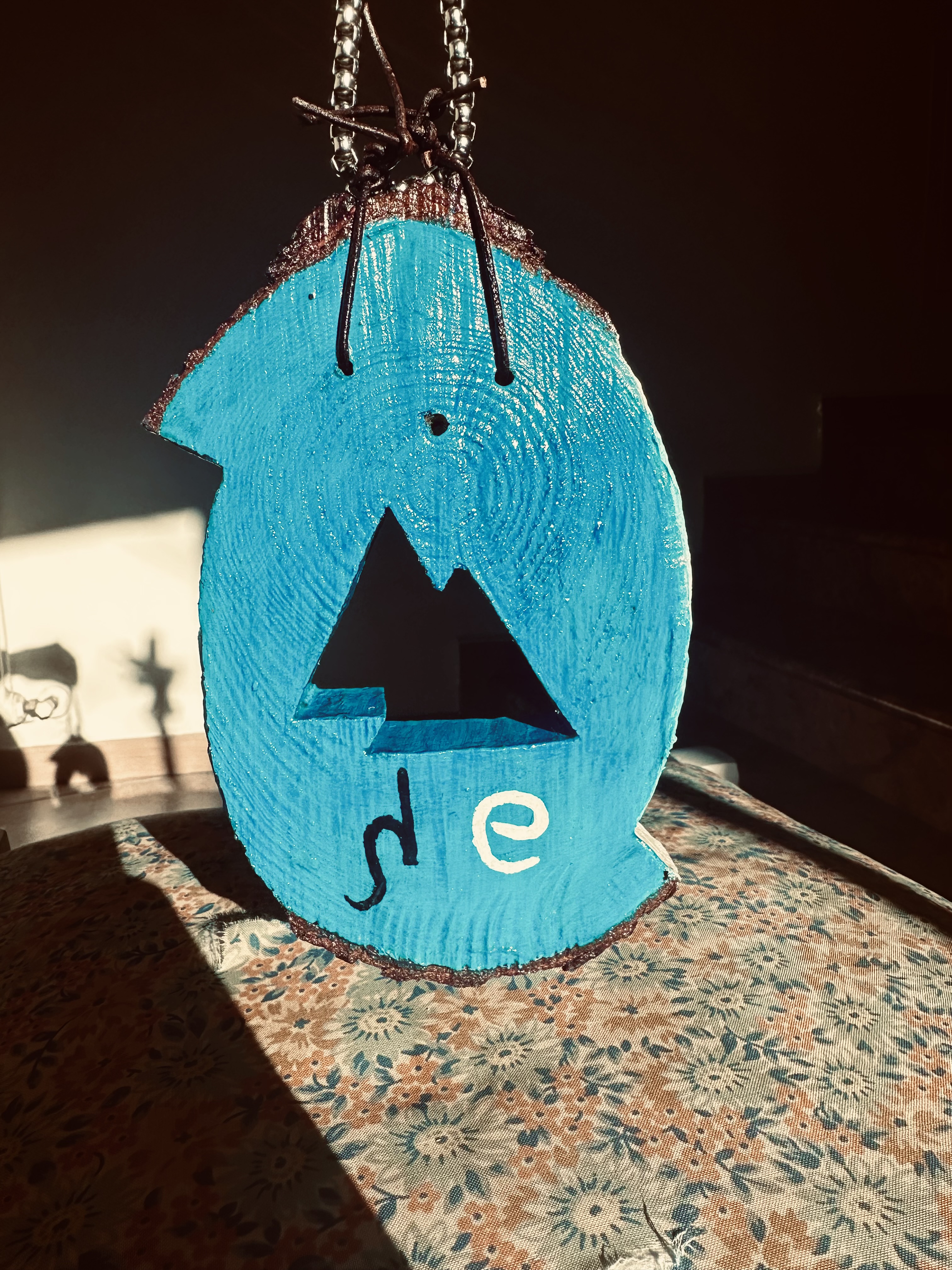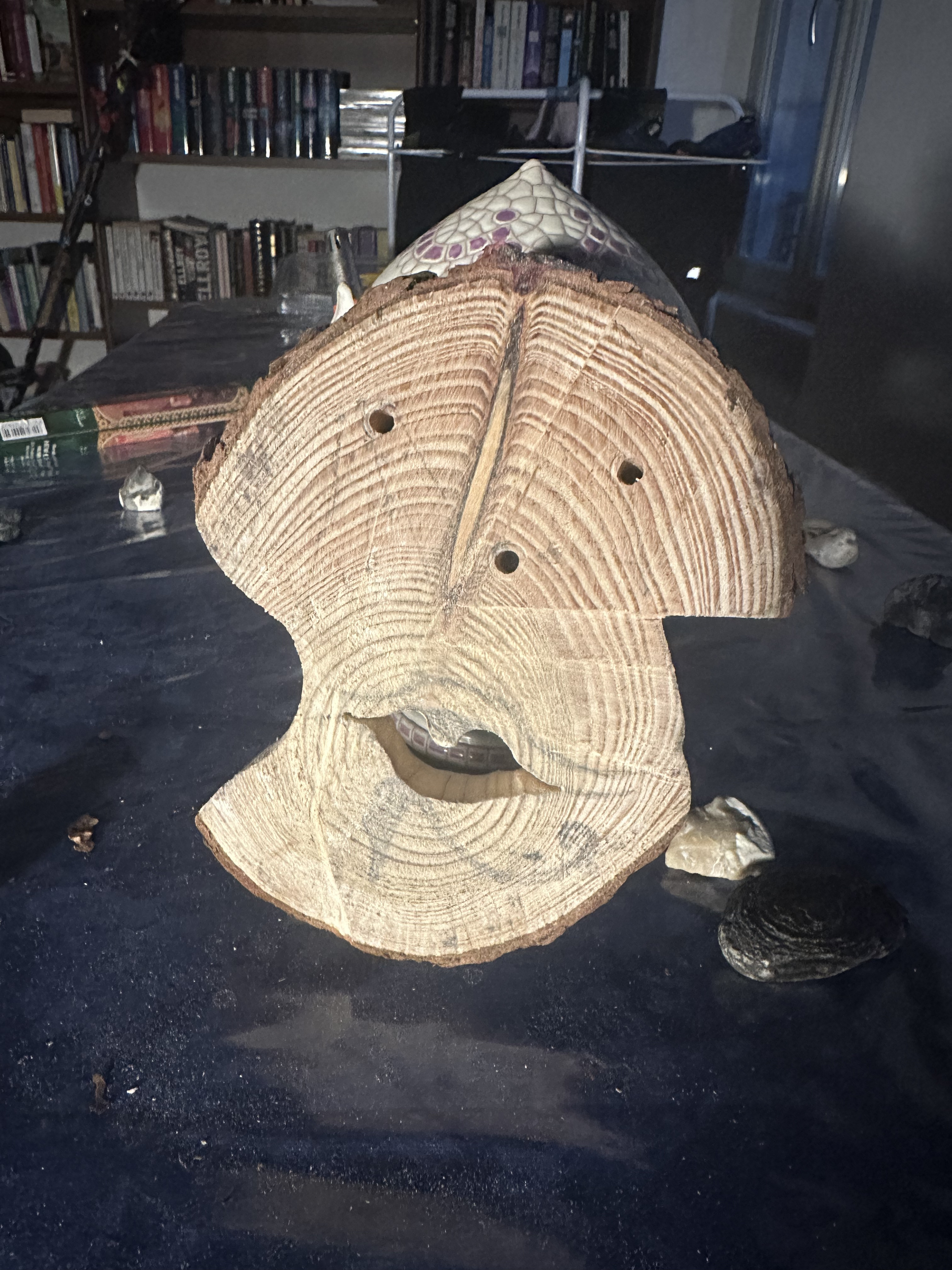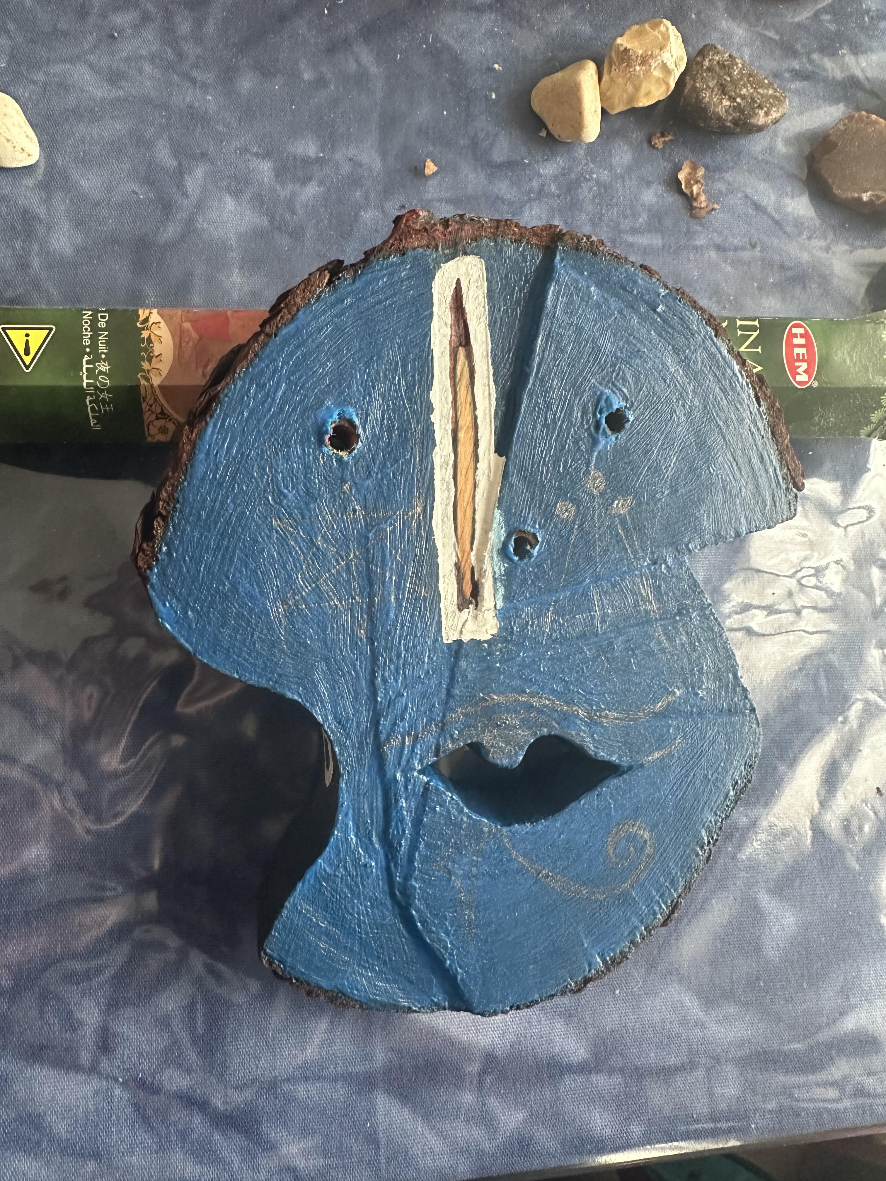 Questo pendaglio rituale è stato completamente creato in diverse canalizzazioni senza una vera intenzione precisa; forme e simboli sono usciti da essa senza una premeditazione. Il legno utilizzato è un pino della Val Di Gresta (TN).