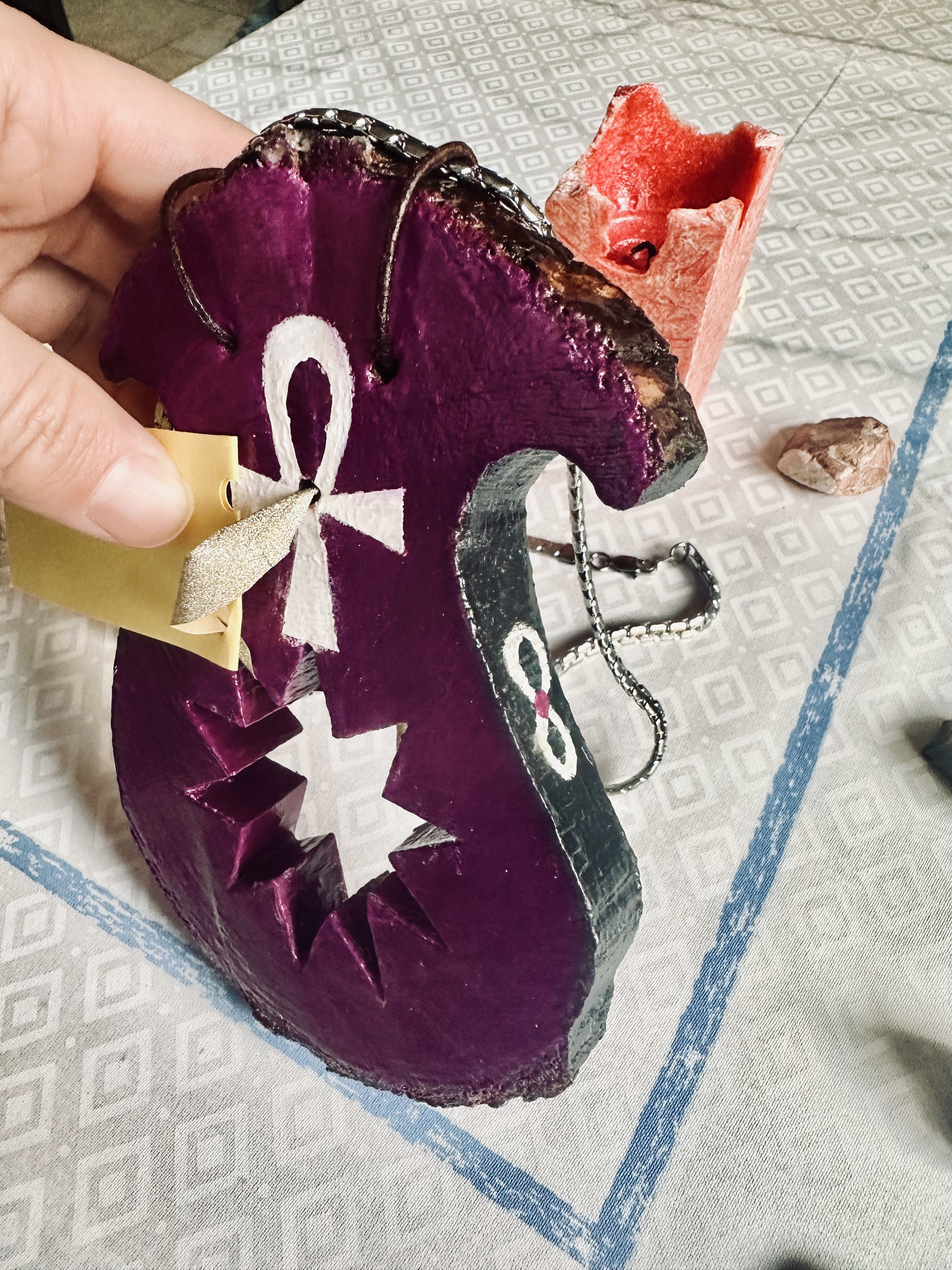 Potere del Pendaglio: è un regolatore di soglia che unisce il sopra e il sotto (decagramma) e li fa circolare senza scissione. Il pentagramma dritto ancora alla Natura e protegge, quello rovescio apre il labirinto dell’istinto e del mistero; insieme trasformano conflitto in asse. L’ouroboros-∞ mantiene il circuito sempre attivo, mentre la sfera centrale richiama il Sé-pivot che decide cosa passa. La legge “morte/nascita” sigilla la reversibilità. L’Ankh, custode, stabilizza e “accende” l’intero sistema, guidando attivazione ed emanazione verso manifestazione equilibrata.