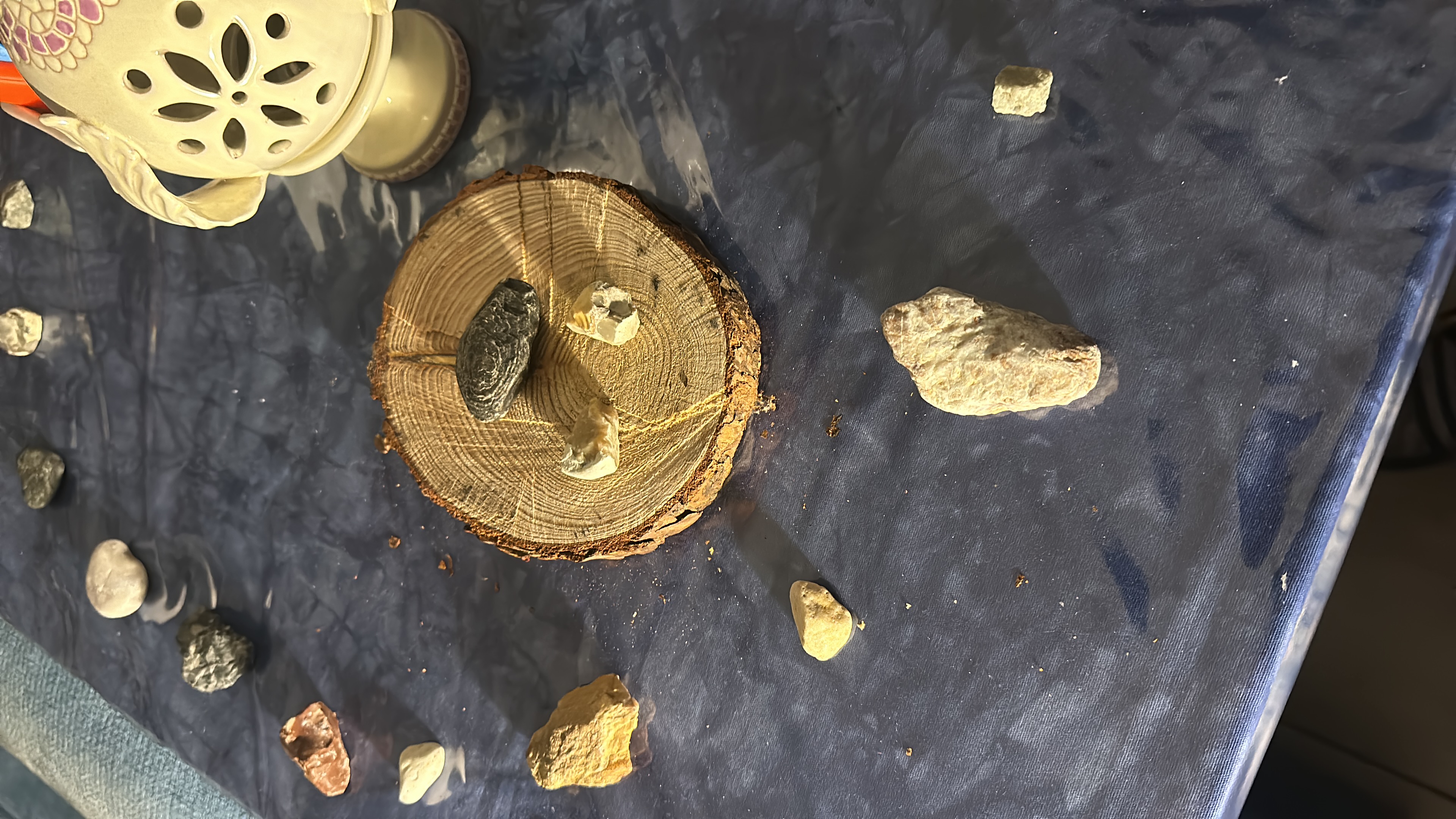 scelte dai molti luoghi in Natura e che, per un motivo o per l'altro, "mi hanno chiamato". Le pietre blu sono fluorescenti,