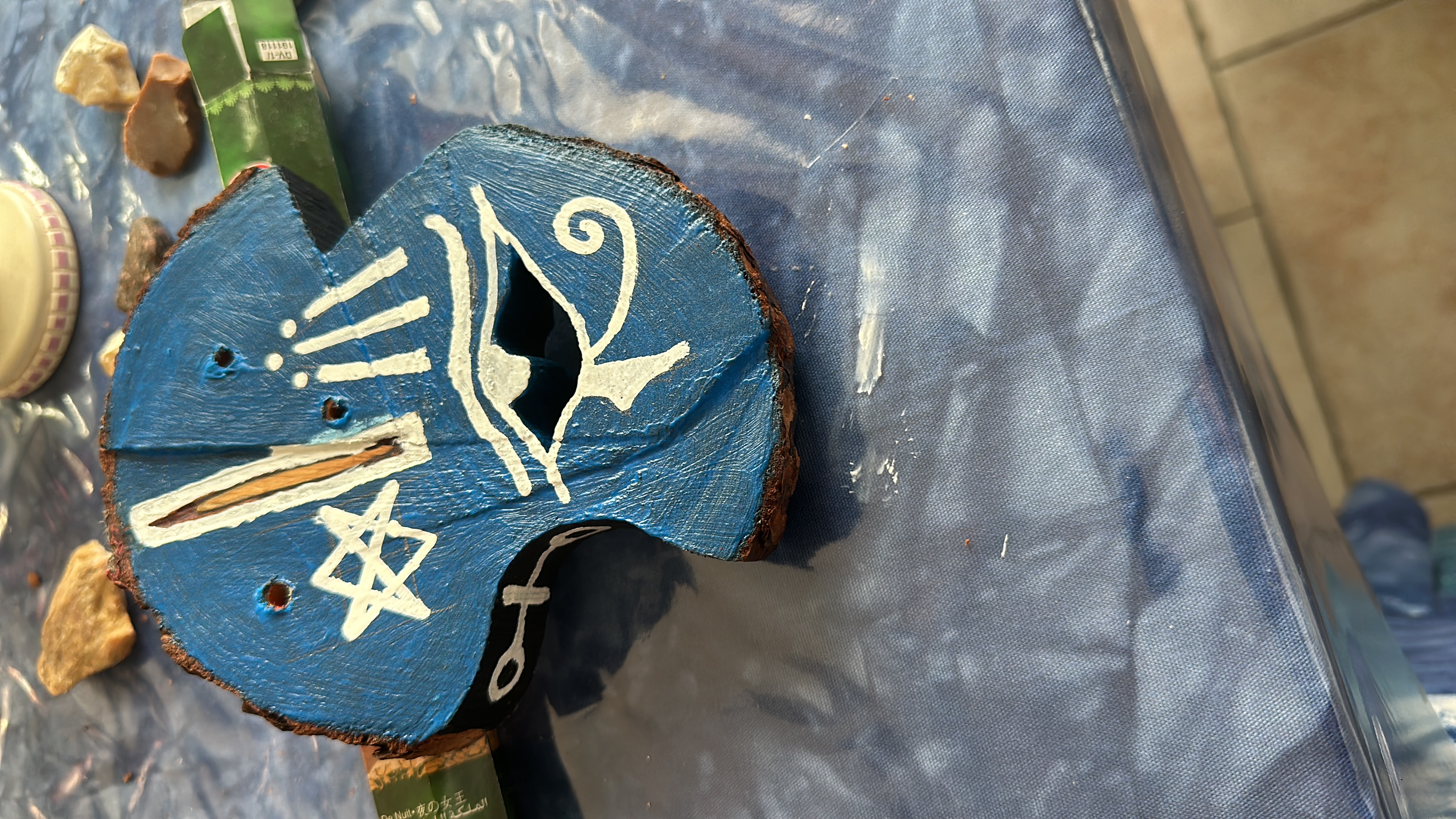 In centro ci sono due piramidi sovrapposte il cui significato mi è quasi oscuro; so solo che ha a che fare con i viaggi stellari e/o con gli Starseed. L'azzurro è legato al 5° chakra "Io Esprimo", interamente protetto da una vernice per esterni lucida. La scritta centrale indica la LEGGE, la legge in senso trismegistiano-crowleyano: si legge "Mùun", che a sua volta, indicando le cifre numeriche, significa letteralmente "da 1 a 9").