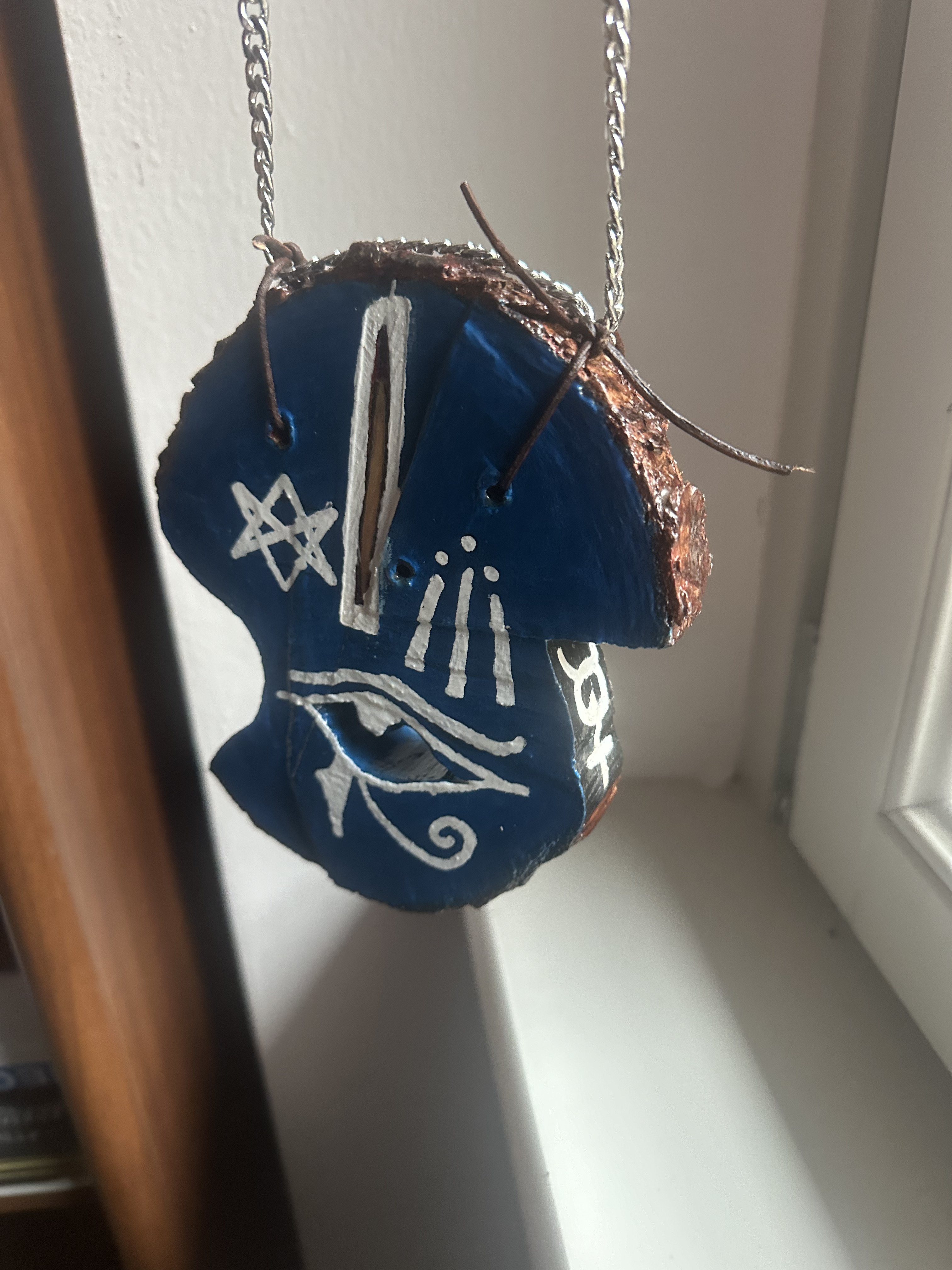 I due buchi per gli anelli di cuoio sono sfasati perché servono per bilanciare il pendaglio; infatti indossato è perfettamente bilanciato. Nel mezzo c'è un ulteriore foro che serve per aggiungerci un "oggetto di potere" o "oggetto di attivazione"; serve per attivare la connessione con il pendaglio e le forze interiori e esterne alle quali esso fa riferimento, che comunque ignoro.
